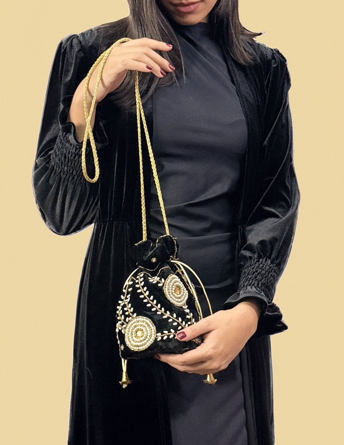 Elegance and delicacy come together in this small velvet box, a jewel of handcrafted fashion designed to accompany you on your most special occasions. Its soft black velvet fabric adds a touch of understated luxury, while beige beaded embroidered flowers add sparkle and femininity with every detail.