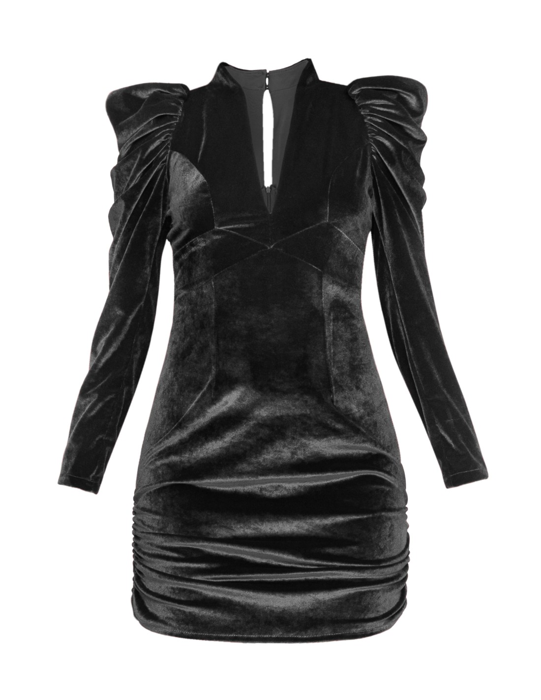 The dress features a deep V-neckline that adds a bold yet balanced touch, ideal for formal occasions. The long puffed sleeves not only follow the latest trends, but also add a dramatic and refined air. The fitted silhouette hugs the curves in a flattering way, while the draped effect on the mini skirt creates texture and accentuates the figure.