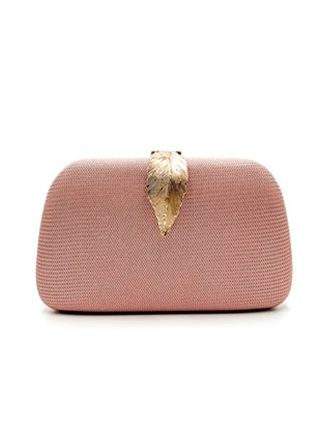 Pink party bag with shiny fabric and decorative leaf-shaped clasp. Elegant, compact and perfect to complete your guest look.