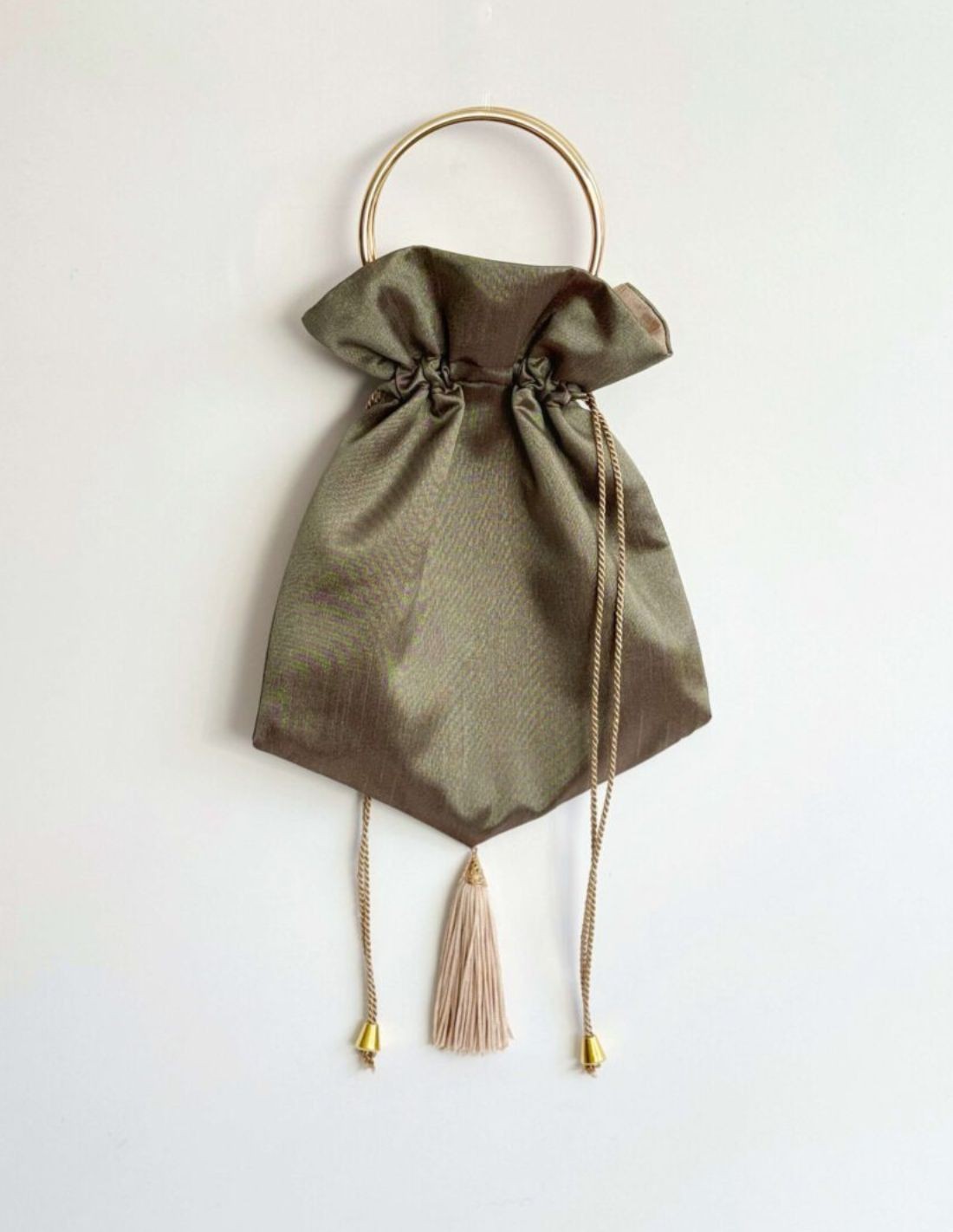 Elegant party bag handmade with taffeta fabric, ideal to add a chic touch to your events or casual looks. Designed with a practical ring to carry it in your hand and an interior chain to hang it, this bag combines functionality and style.