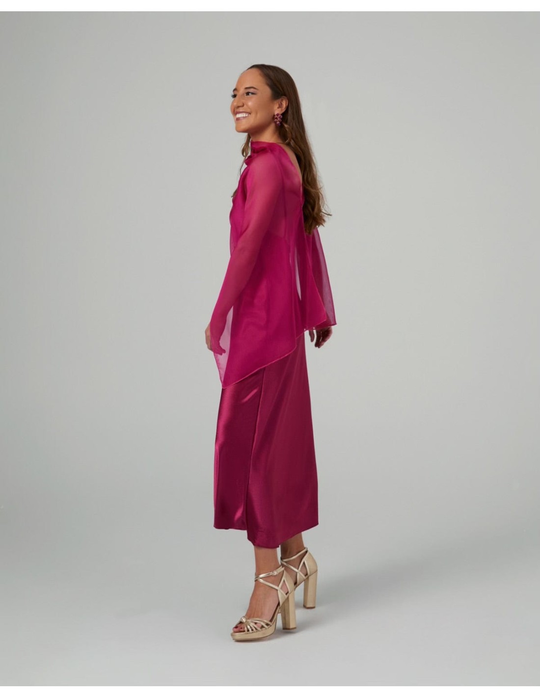 This guest cape is made in a beautiful bougainvillea-coloured cationic chiffon, ideal for weddings, parties, graduations, christenings or communions. The bougainvillaea shade is perfect for those looking to stand out in an elegant and contemporary style.