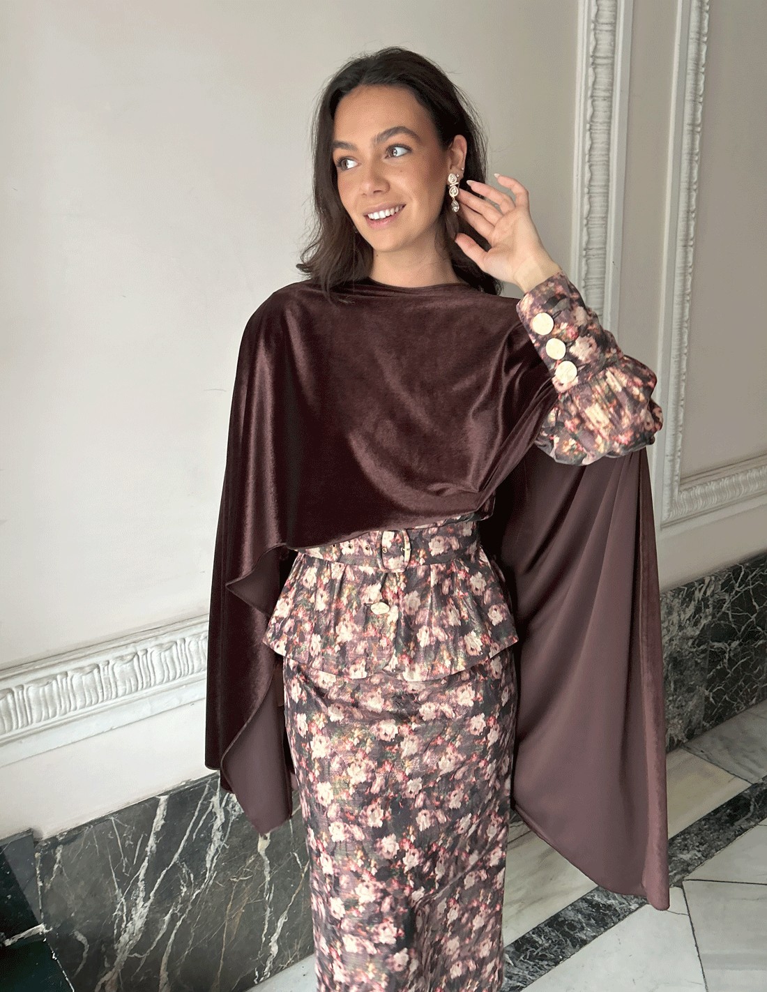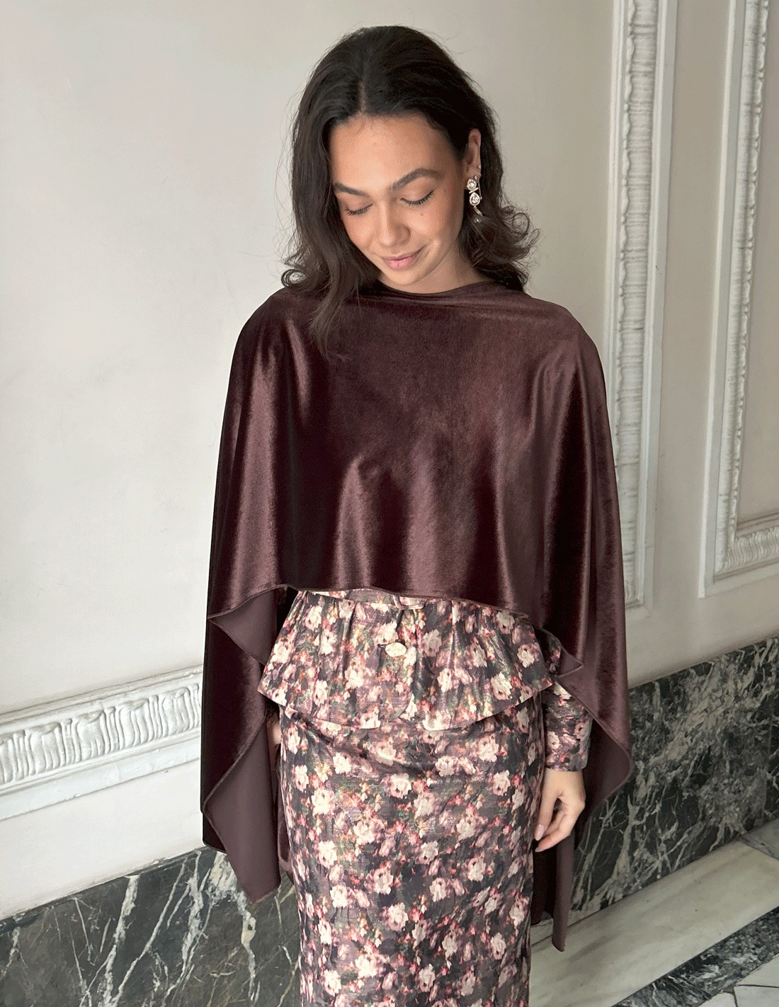 how to wear a multi-position velvet cape to a guest event? The multi-position fine velvet guest cape is one of those pieces that elevate any look just by incorporating it. Its velvety fabric adds elegance and a touch of luxury, while its multi-position design allows you to adapt it in different ways: loose over the shoulders for a classic look, crossed in front for a sophisticated effect, or gathered at the side for a more modern style. It is perfect for fall and winter weddings and events, as it adds warmth without detracting from the lightness of the ensemble.