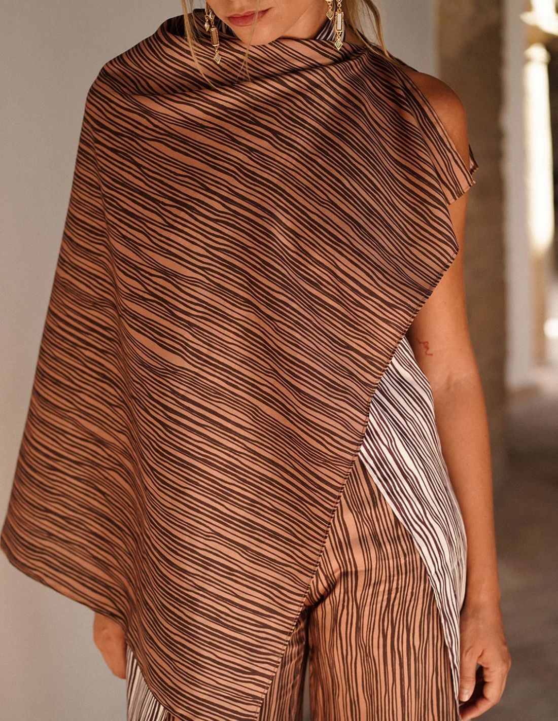 If you already have your guest look for your next special occasion but you are looking for how to give it that original and differential touch, this square cape could be the ideal option, or even if you want to complete the set of top and pants that combine with the cape. A versatile garment with a square design, in different shades of brown with a uniform stripe print.