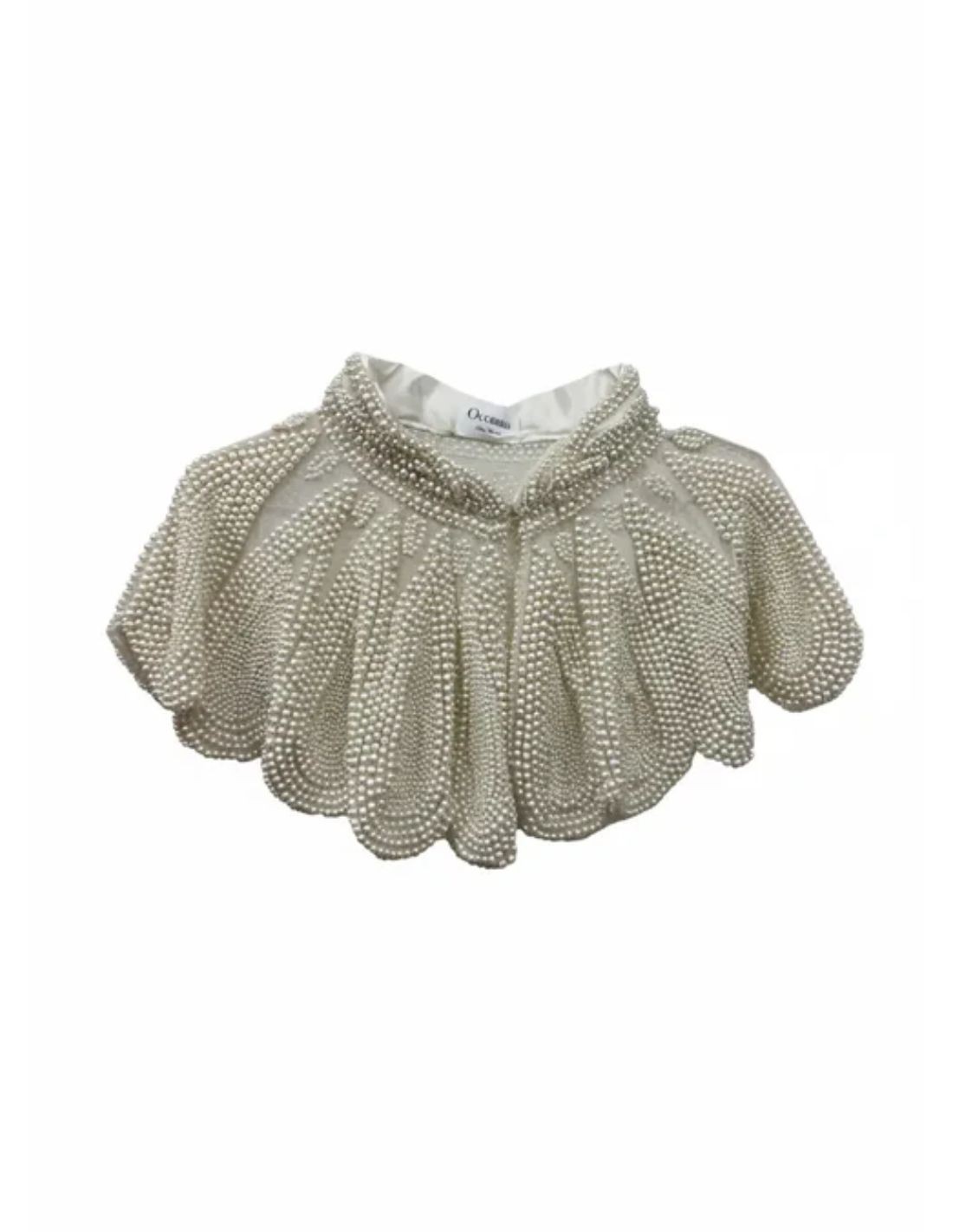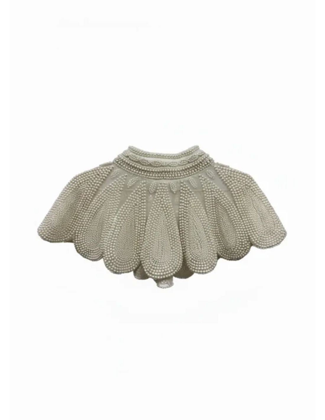 This jewel neckline is an exclusive piece that elevates any outfit with a touch of elegance and distinction. Its structured design and meticulous finish enhance the silhouette, bringing sophistication and visual balance. Decorated with delicate pearls arranged in a harmonious way, it creates a luminous and soft effect, ideal to complement a wedding dress or a ceremony look.