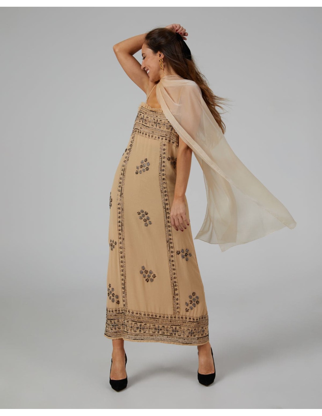 Long cape in light gold cationic gauze.