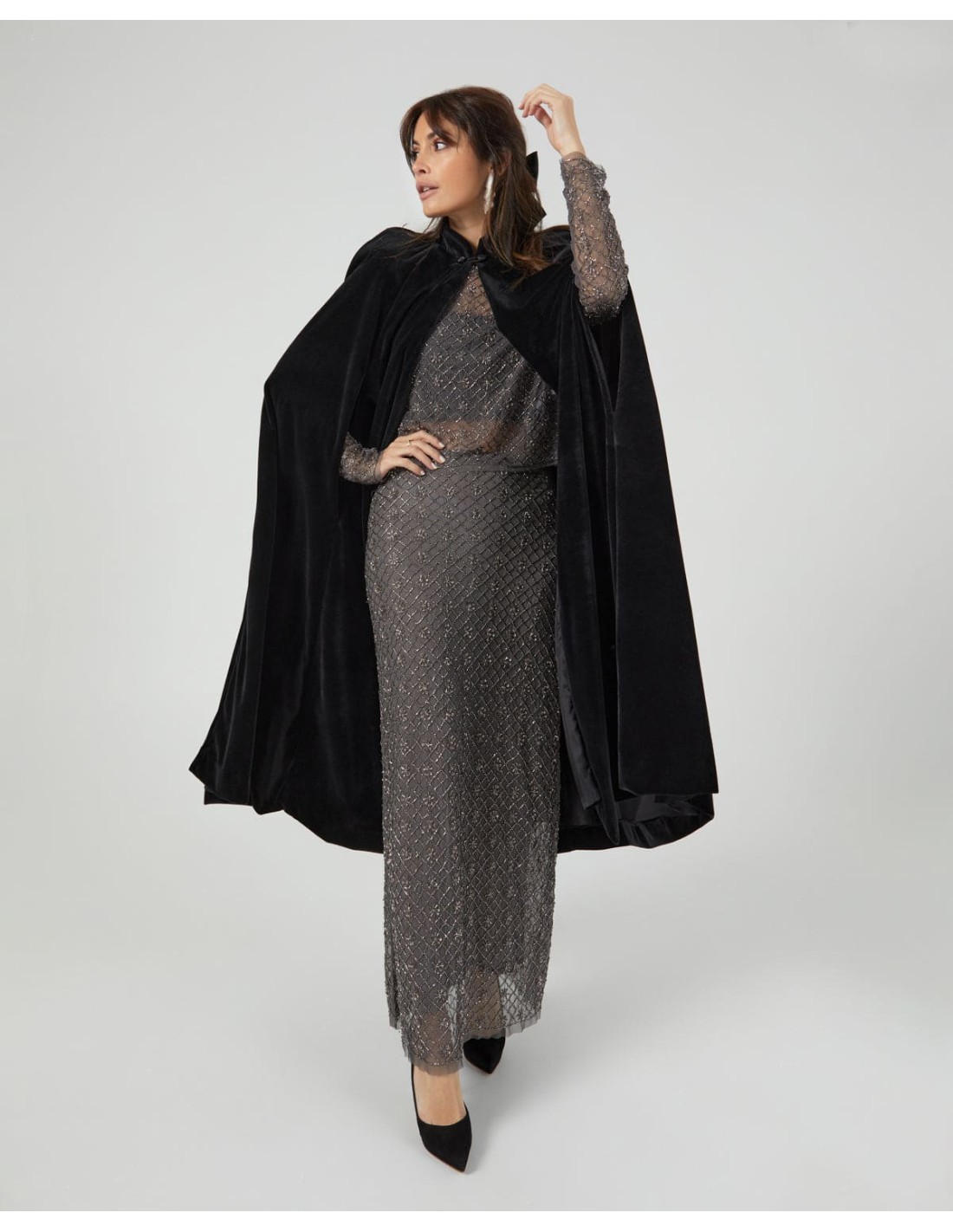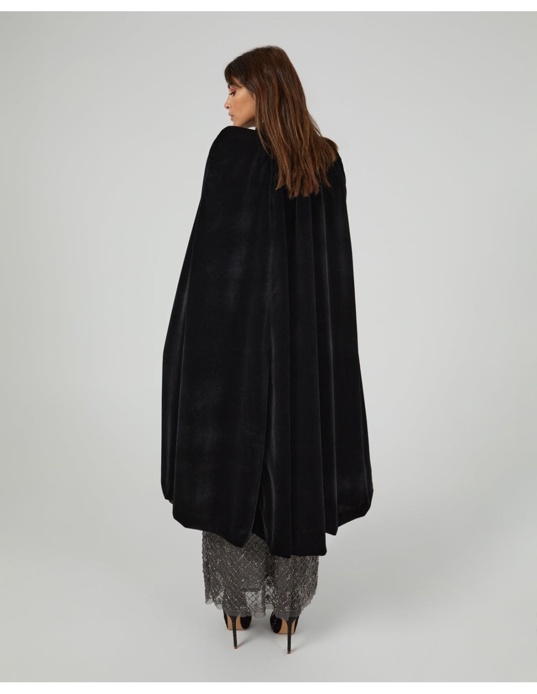 This event cape is made of delicate black velvet, ideal for those seeking elegance and sophistication. Handmade, it features elegant shoulder pads that enhance the feminine figure and a flowing design that adds distinction.
