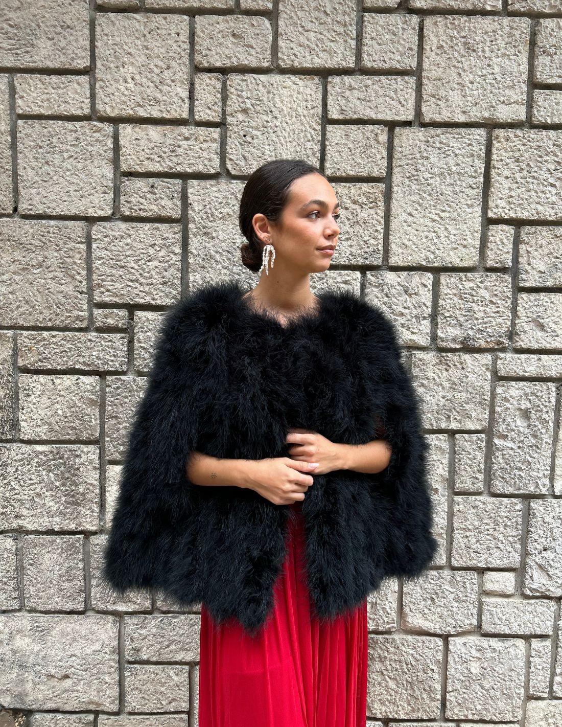 Discover the timeless elegance of our ostrich feather cape. Each feather has been carefully selected and hand-dyed to achieve a unique and vibrant colour. Its 75 cm length and wrap-around design will give you a feeling of comfort and luxury. Perfect for adding a bohemian and sophisticated touch to any outfit.