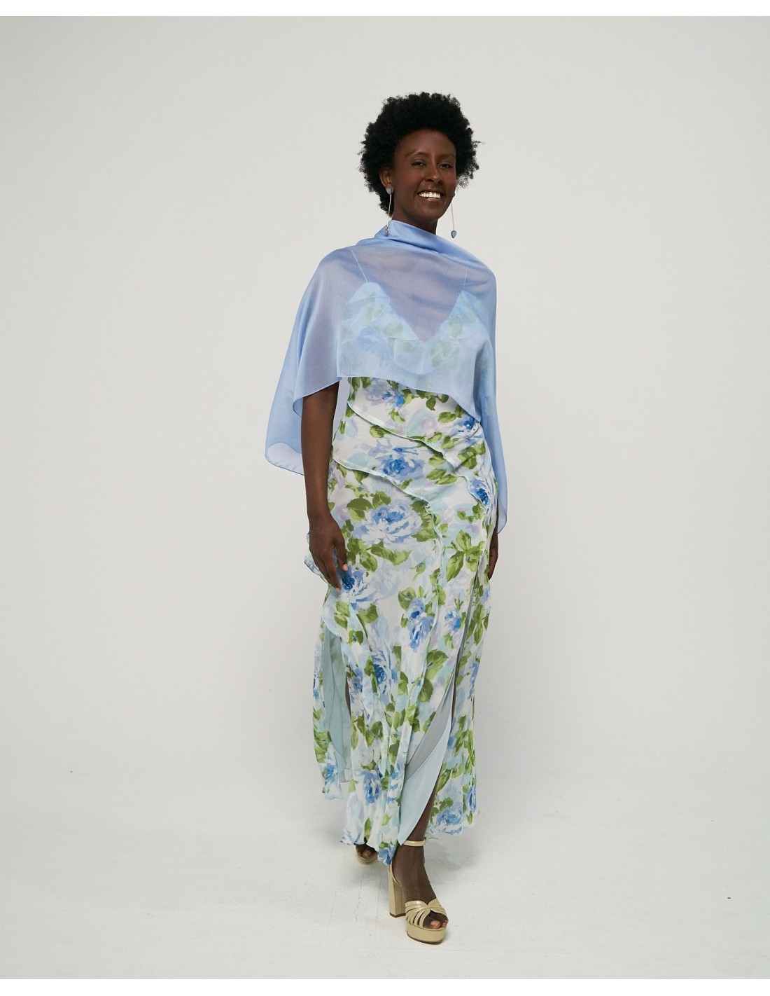 Complete your guest's look and give it a special touch with this short chiffon cape for wedding guests in light blue, ideal to keep warm from the cold in autumn-winter events. A cape made of double-thread cationic chiffon in light blue. The ideal accessory to wear to church or even to elevate your look for any event, whether weddings, communions, baptisms...