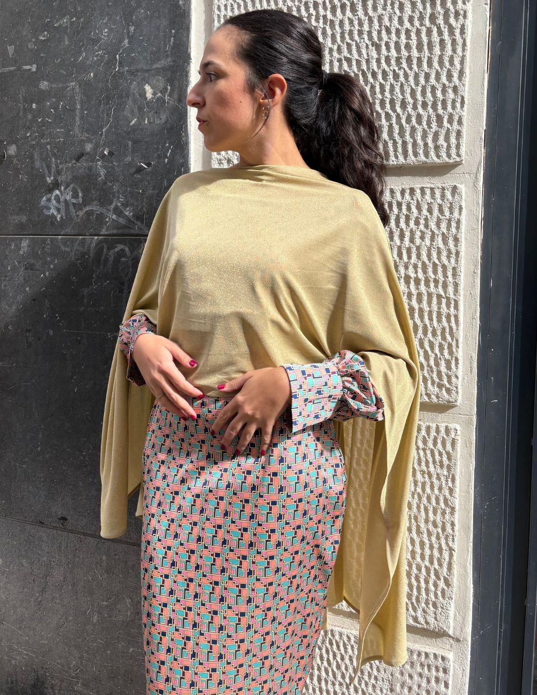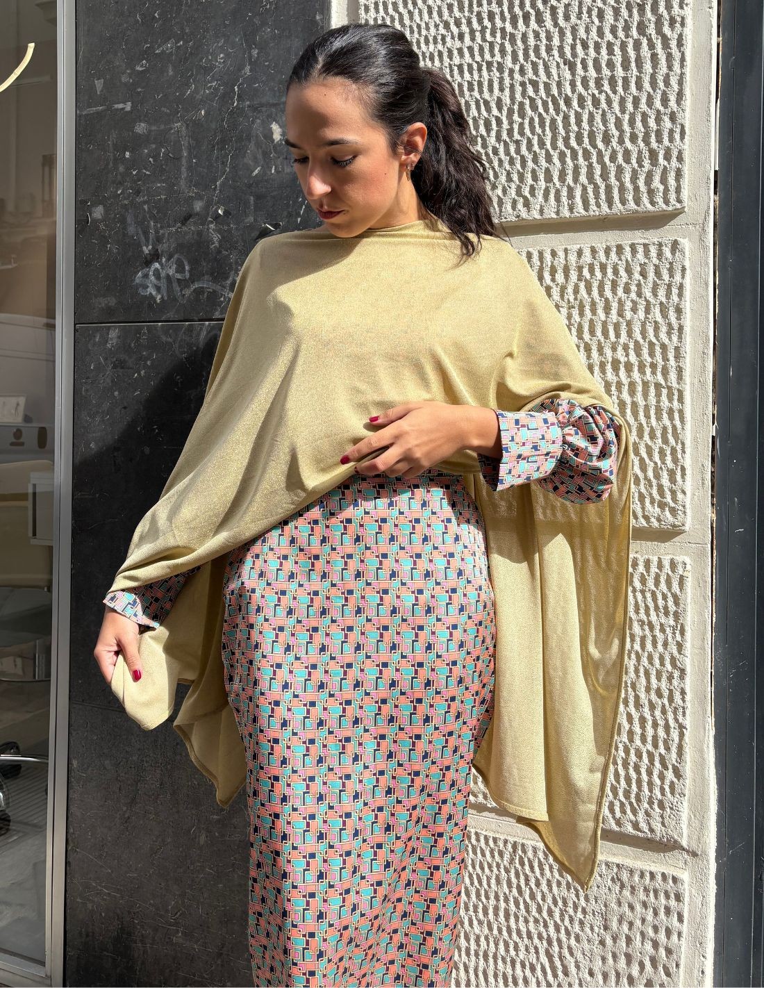 If you are looking for a special accessory for your fall events, this short party cape will be your favorite. You will be able to wear it in all kinds of occasions, both formal and casual. Made in a shiny fabric in golden color. Versatile and perfect to combine with dresses, outfits, suits... or even in a more everyday way. It is a multiposition model that you can place as you like. Its glitter fabric brings a sophisticated touch that will be a yes for your party look.
