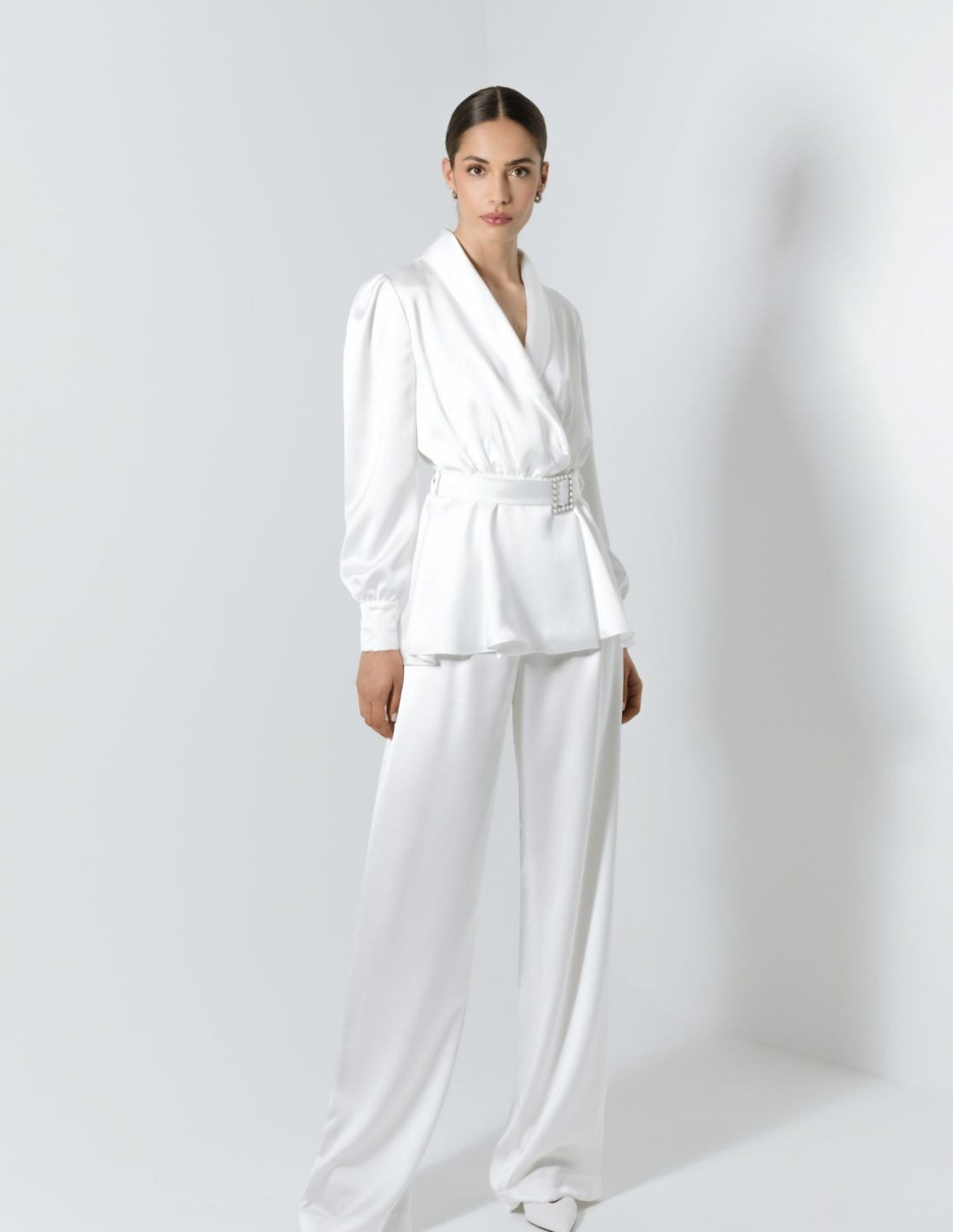 Elegant wedding suit composed of a tunic jacket with long puffed sleeves and jewel belt and light long trousers that closes with invisible zip. A comfortable and perfect total look to meet the most special moment.