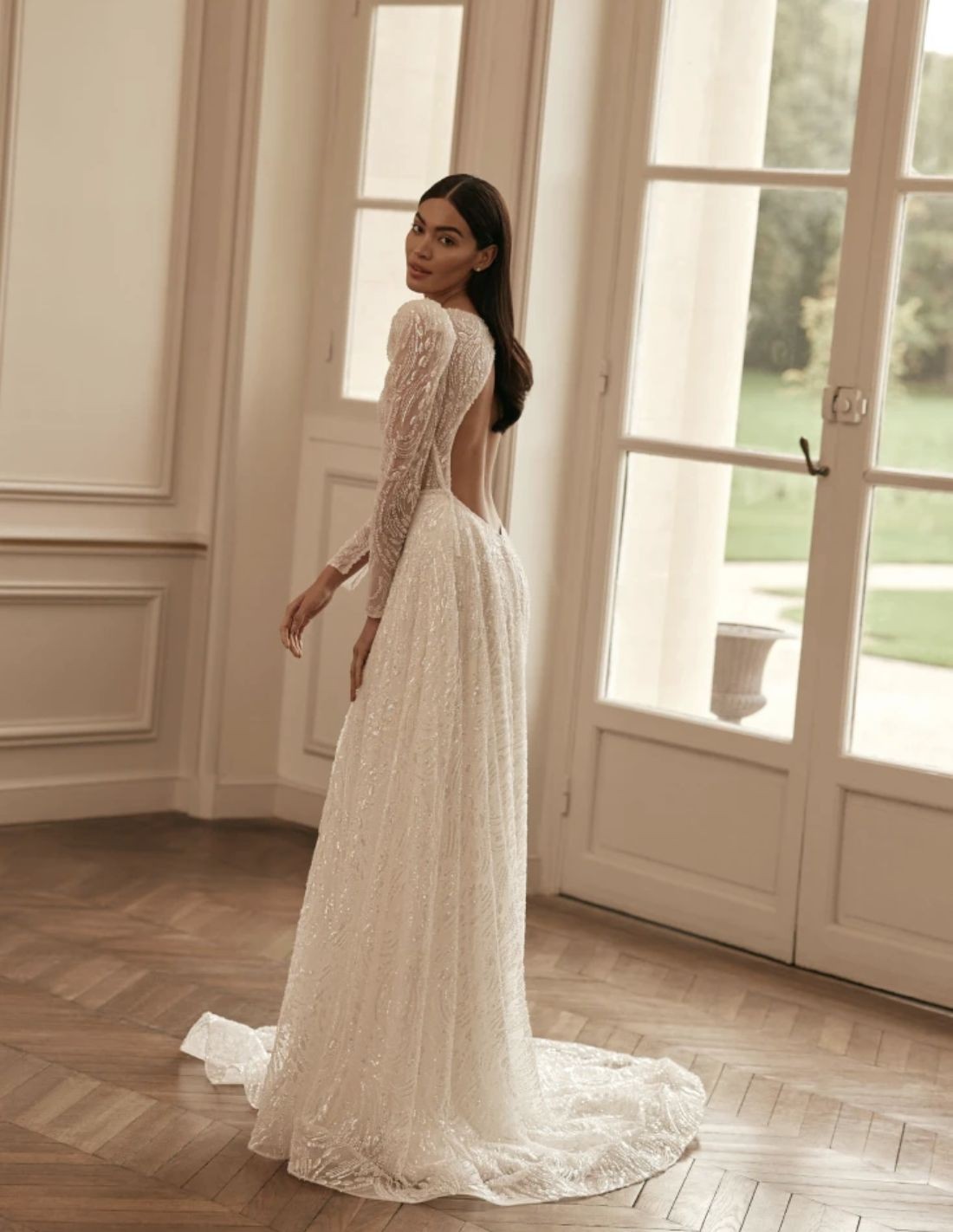 This design features an elegant and sophisticated cut in ivory embroidered lace with a small train. The top of the dress is semi-transparent, with a V-neckline to the waist and decorated with diagonal pleating. The back is completely uncovered and will highlight sensuality.