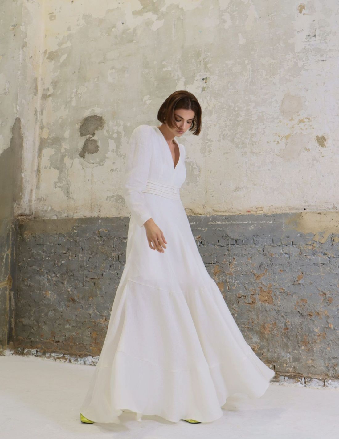 This dress for civil brides or as a second dress is made in 100% linen fabric providing freshness and lightness typical of summer. Its design features an elegant V-neckline front and back, long puffed sleeves, a pleated waist, and a long flared and voluminous skirt. It closes at the back with lacing and an invisible zip.