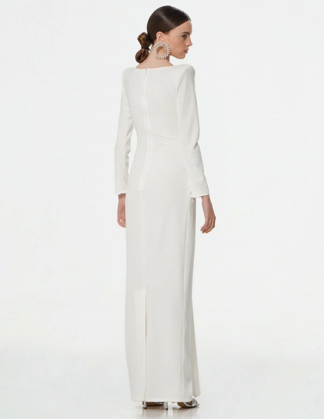 Long white dress with straight cut-semi mermaid and maxi length, designed for sophisticated women looking to shine in special events. With structured shoulder pads, long sleeves and an elegant cut off on the chest, it incorporates a bow on the abdomen that stylizes the silhouette.