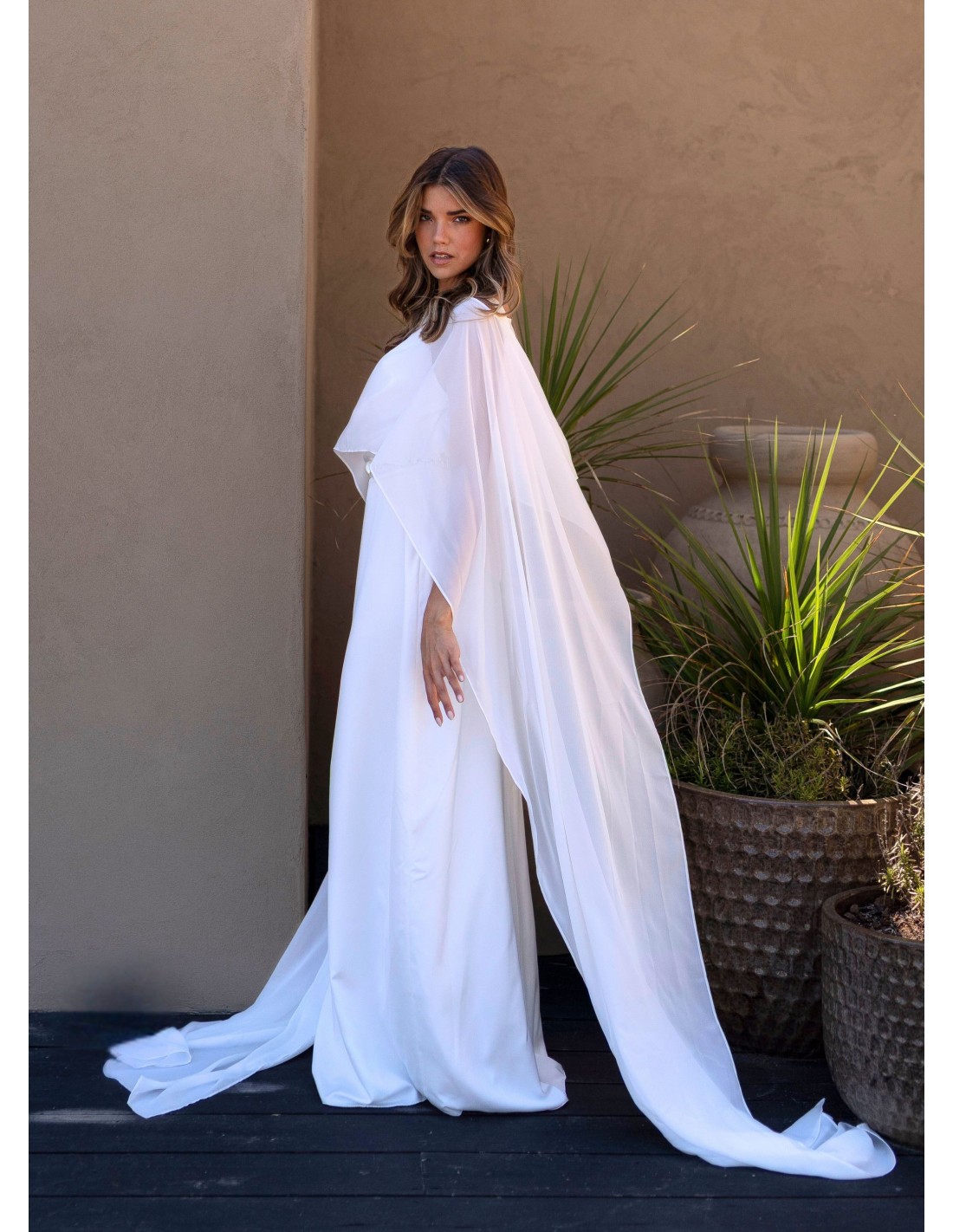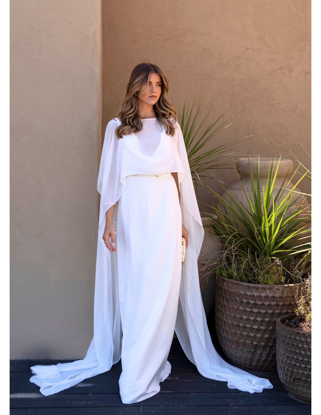 This long white dress with plunging neckline is synonymous with elegance and sophistication. Its clean and feminine design features a flowing front and back neckline, which adds a delicate and romantic air. The cutout at the waist enhances the silhouette, while the invisible side closure ensures an impeccable fit.