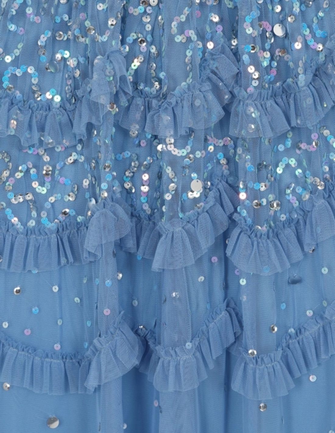 Long party dress with mini ruffles and blue sequins for special occasion guests.
