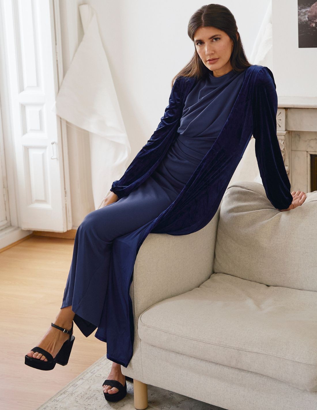 Blue velvet midi coat with crossover neckline for guests and special occasions.