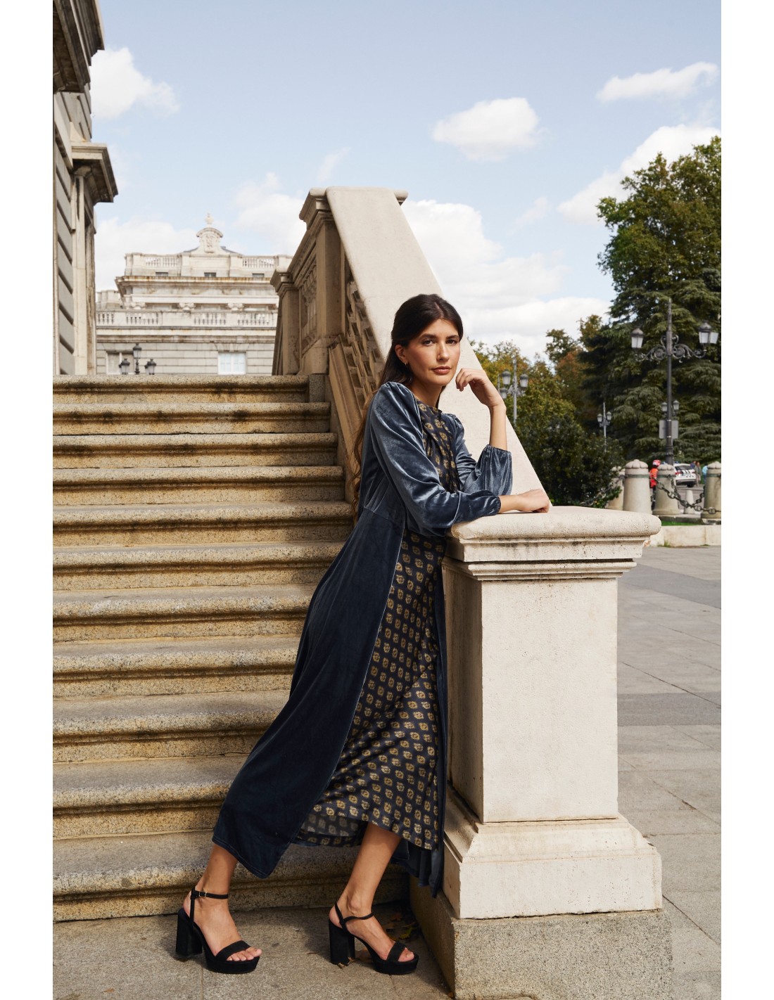 Its structured design and shoulder pads enhance the feminine figure, offering a sophisticated silhouette. Wear it as a loose or knotted coat, or turn it into a velvet crossover dress, ideal for evening looks.