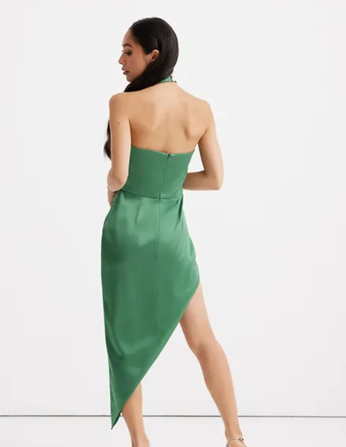 This guest dress comes in a variety of colors with a cut-out halter neckline in the center, a non-slip back for extra support, an ideal asymmetric skirt, and an invisible zip fastening at the back. In a subtle satin fabric.