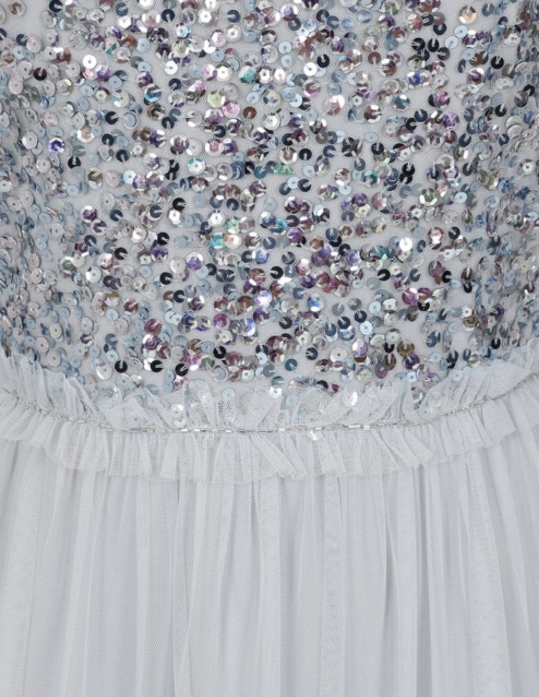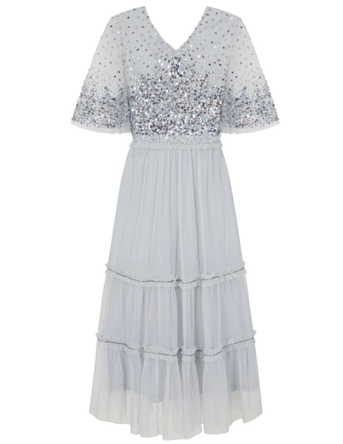 This guest dress is made in a delicate tulle embroidered with ether blue sequins.