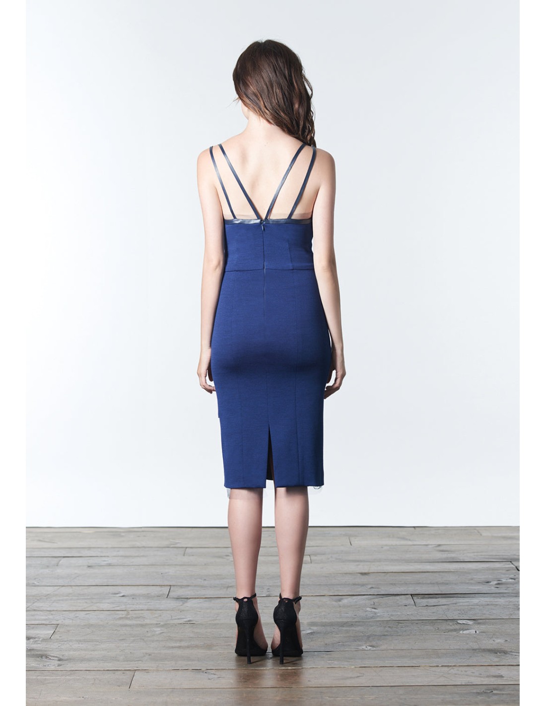 Minimalist bluecocktail dress with double straps for formal occasions.