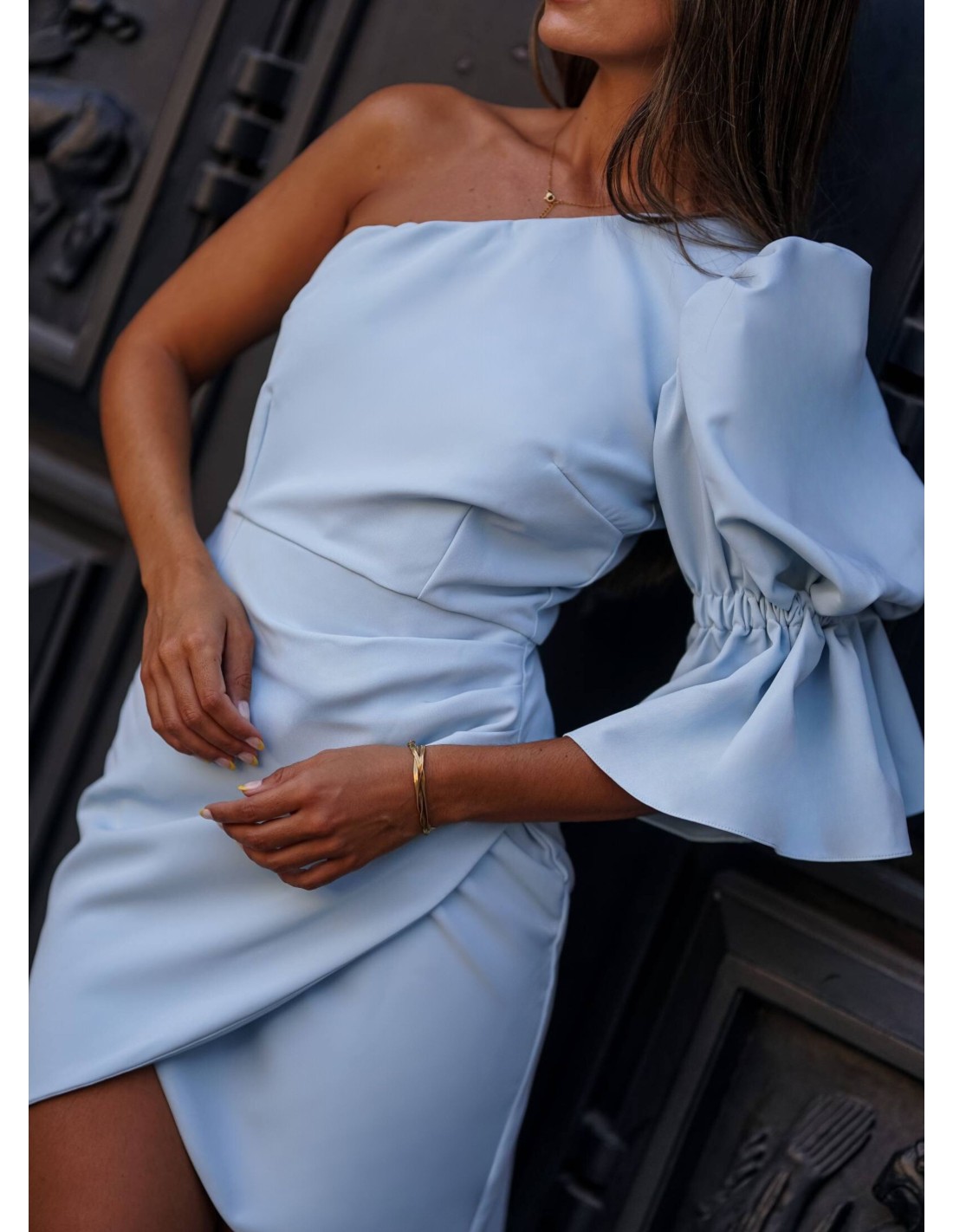 Short blue dress with asymmetrical neckline and puffed sleeves