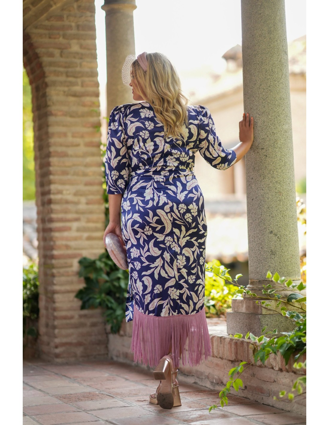 If you are looking for a sophisticated, feminine look with a touch of trend, this satin printed midi guest dress will be your best choice. Its straight cut design with V-neckline, fringed hem and matching lined belt frames the figure and enhances the silhouette in a very flattering way.