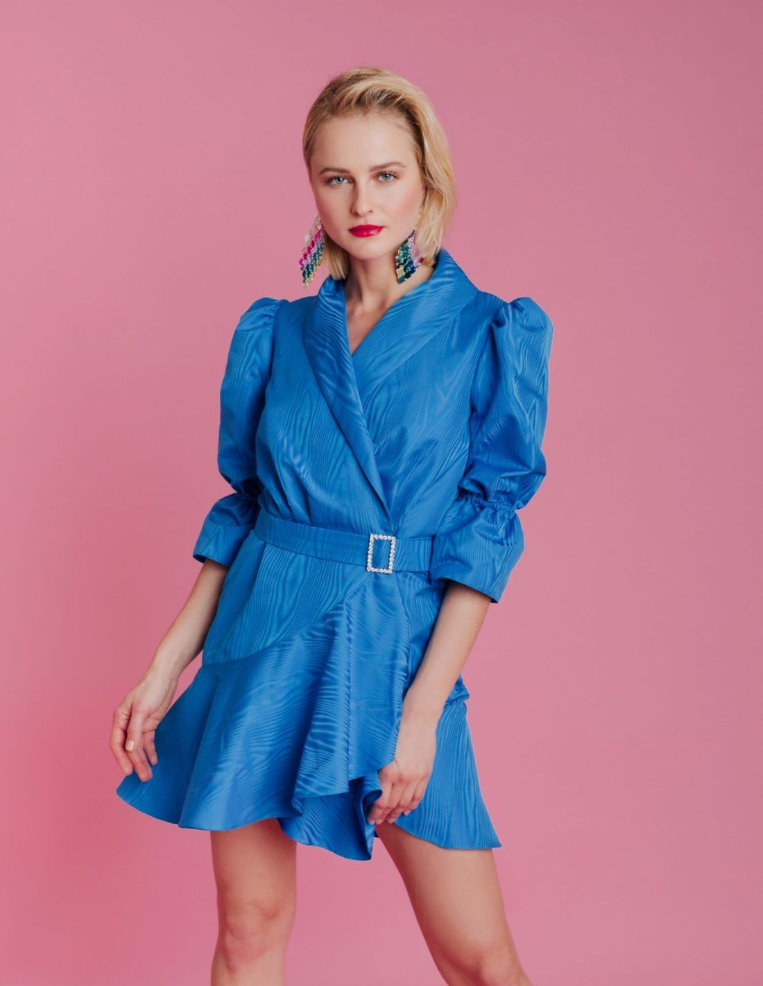 This beautiful short guest dress is made from delicate blue taffeta. It features a crossover cut with ruffle at the hem, short puffed sleeves, jewelled belt and dinner jacket lapel. It closes with an inner button and a lined button on the outside.