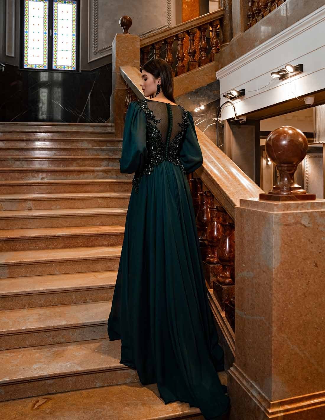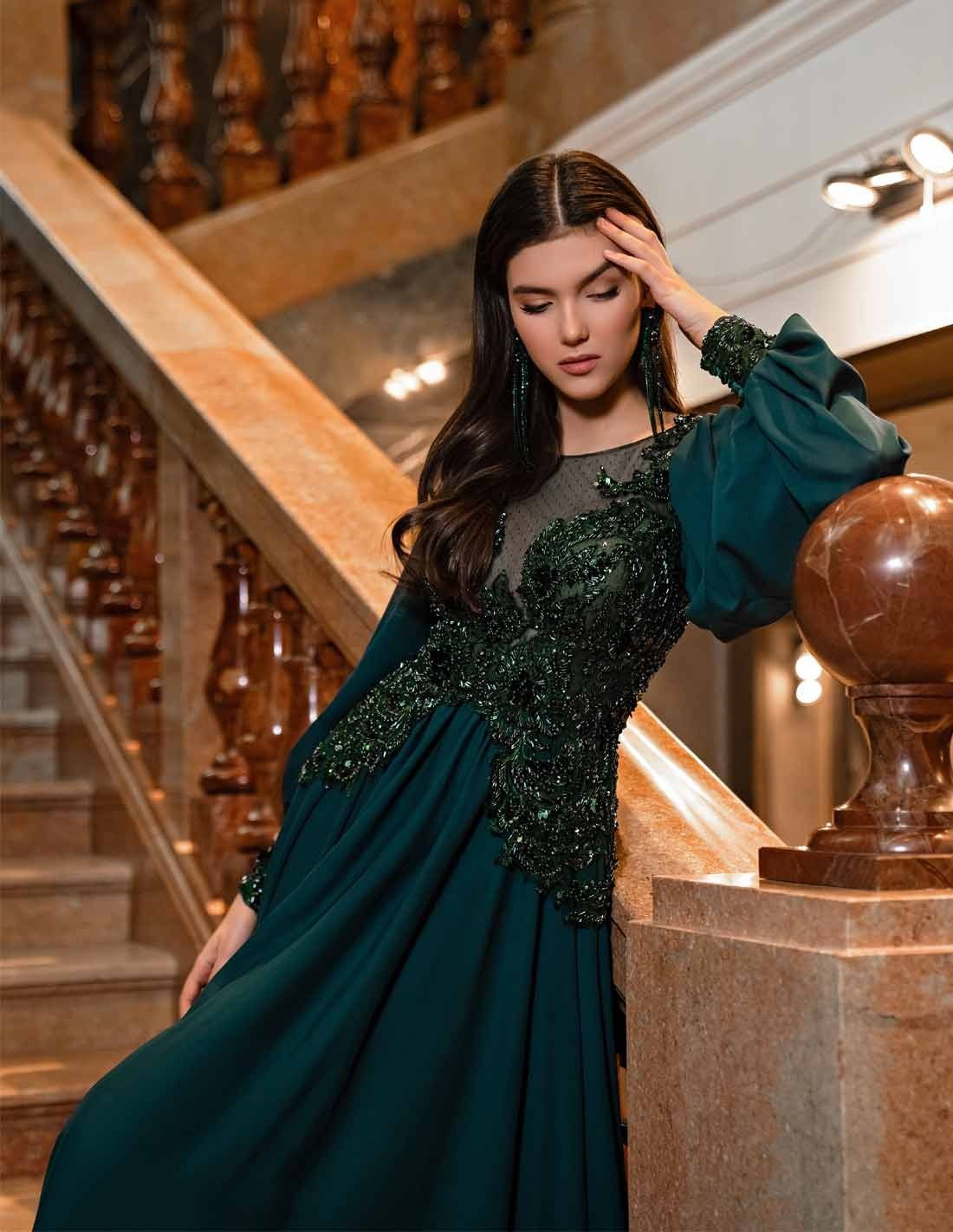 Long chiffon party dress with embellished bodice