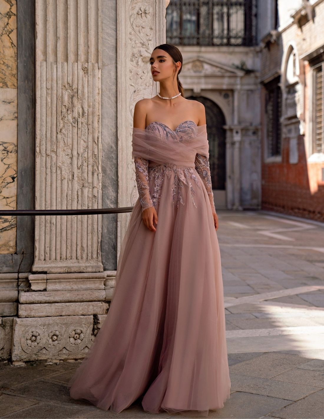 This party dress for guests is made in tulle combined with embroidered lace available in powder pink and grey. Its design features a sweetheart neckline with draped plunging sleeves combined with long nude mesh and a long skirt with layers of tulle.
