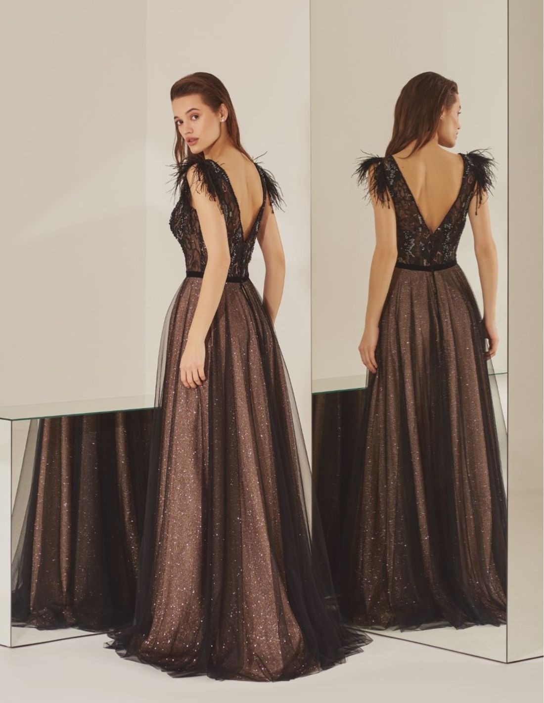 Black long party dress in tulle with feathers on the shoulders for special occasions.