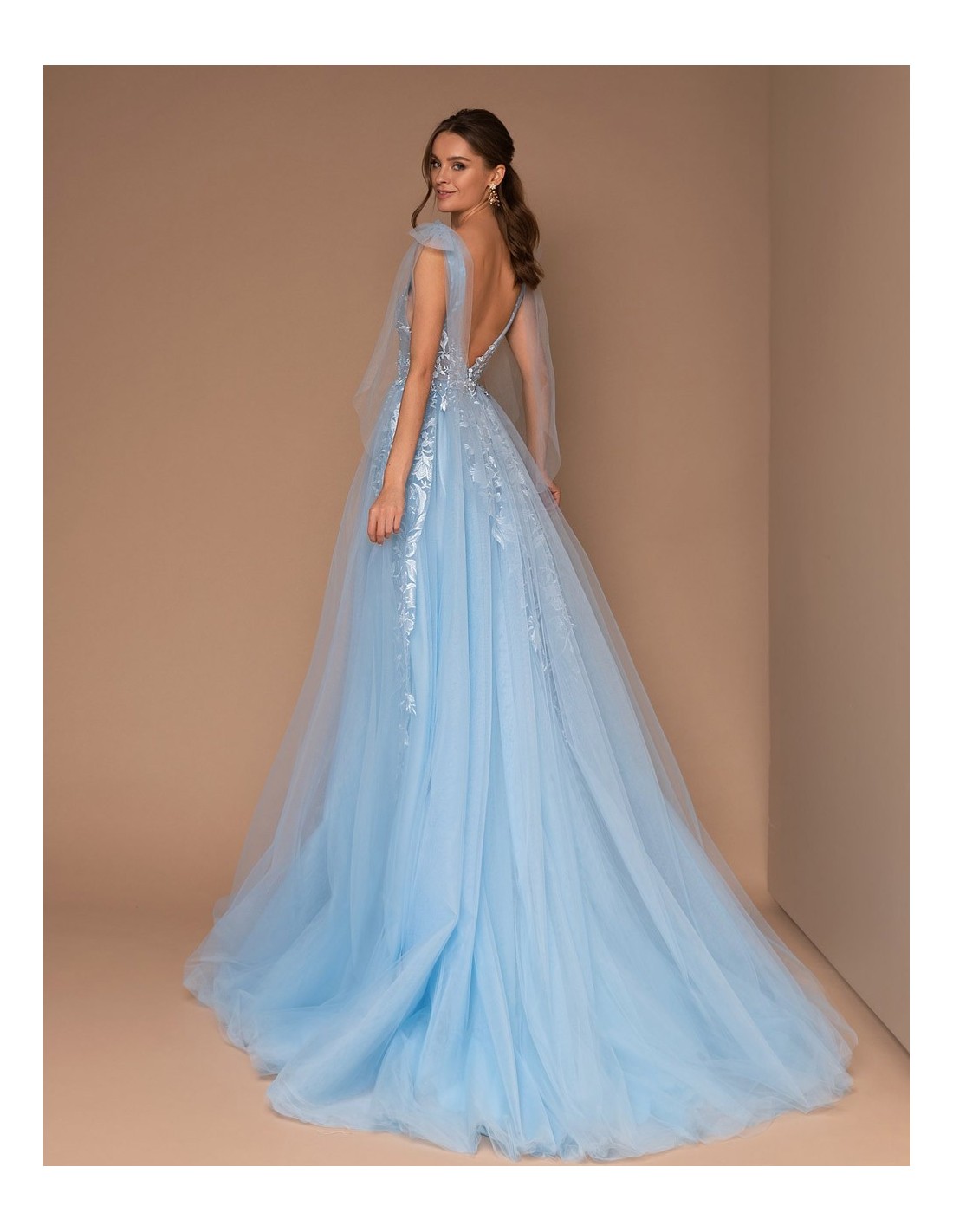 Long tulle party dress with plunging neckline