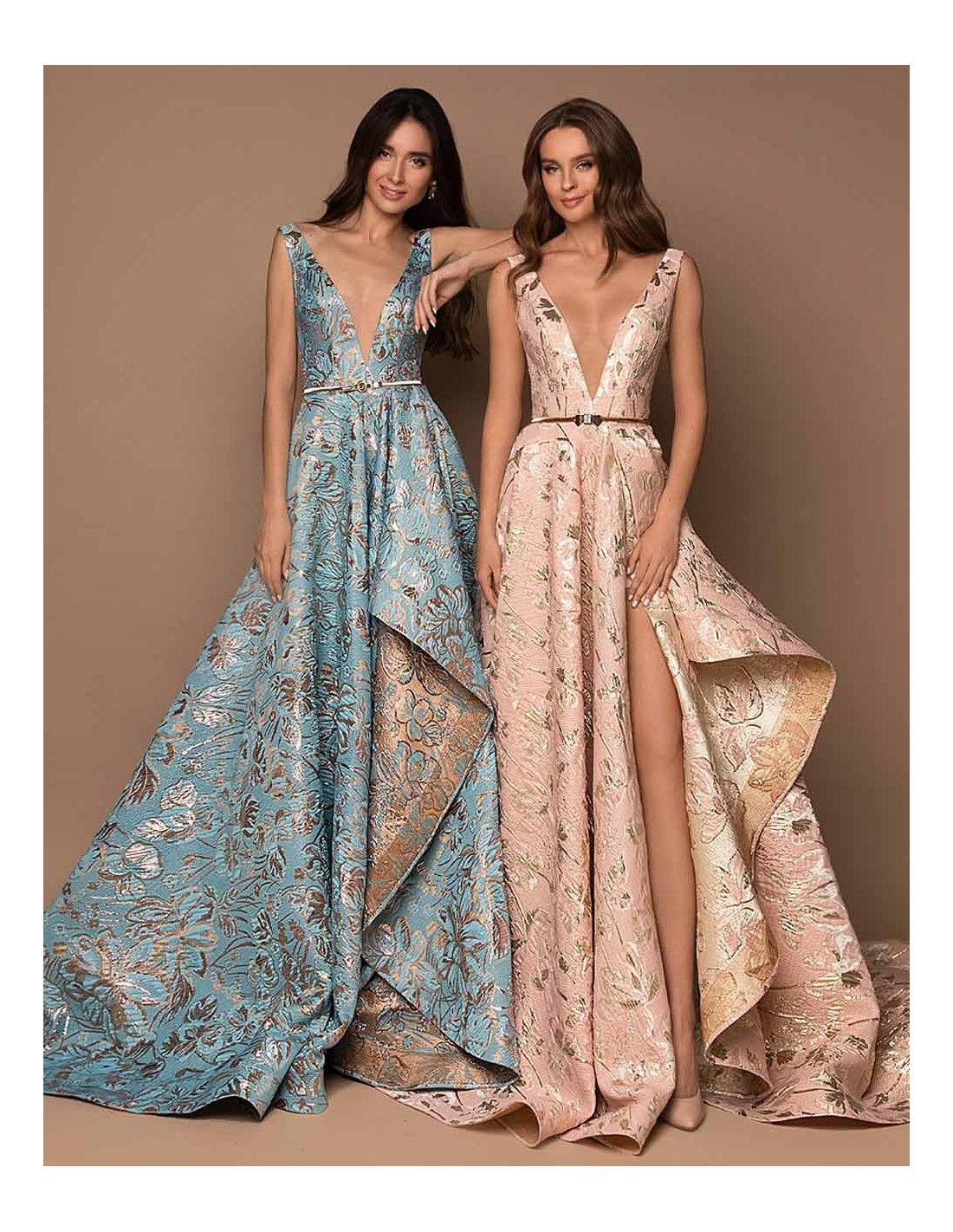 Evening dress made of jacquard fabric with V-neckline and voluminous skirt.