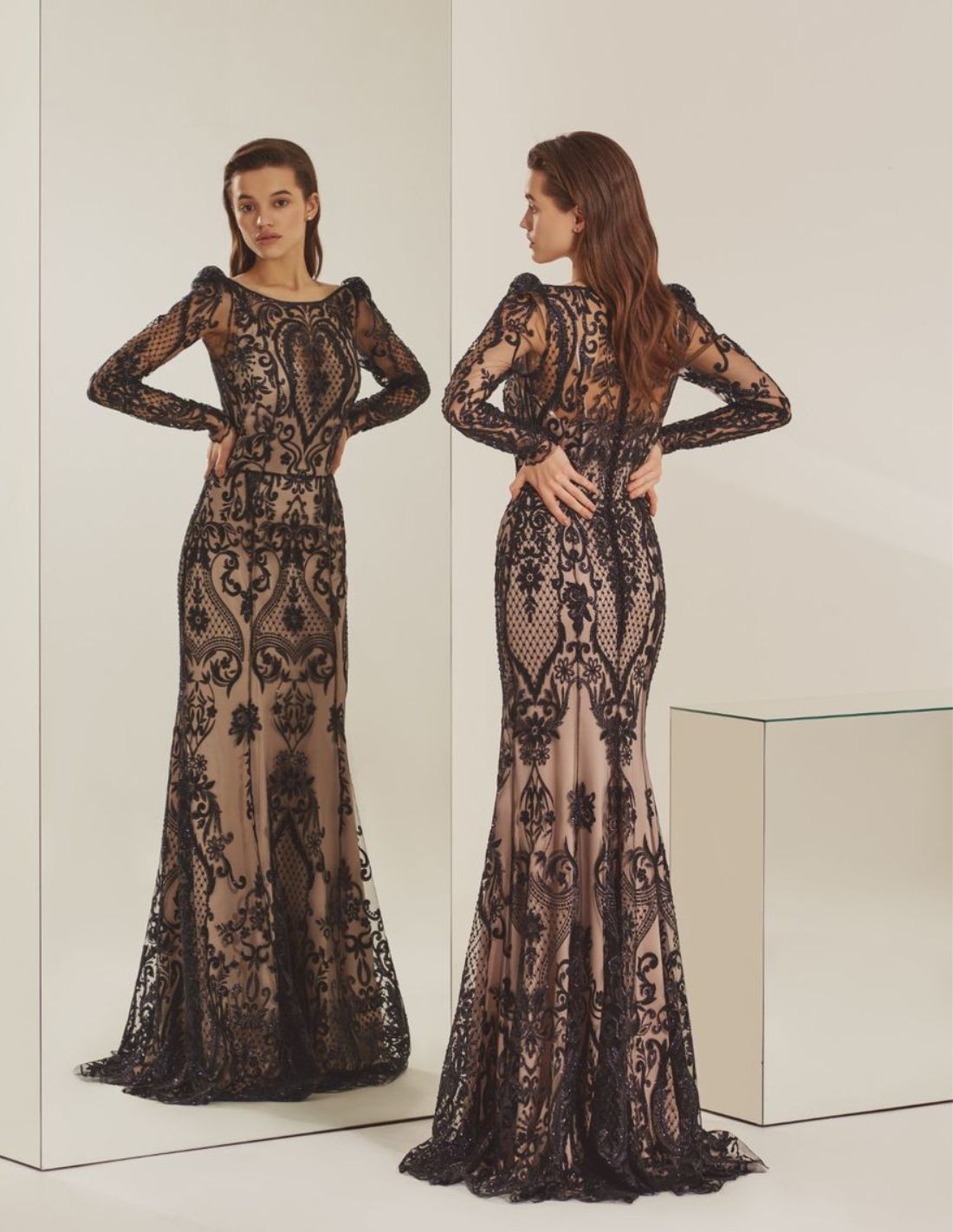 This elegant wedding guest dress is made of a nude base fabric with a flattering black lace stitched overdress. Its design features a boat neckline, long sleeves, mermaid cut and back with lined buttons and invisible zip fastening.