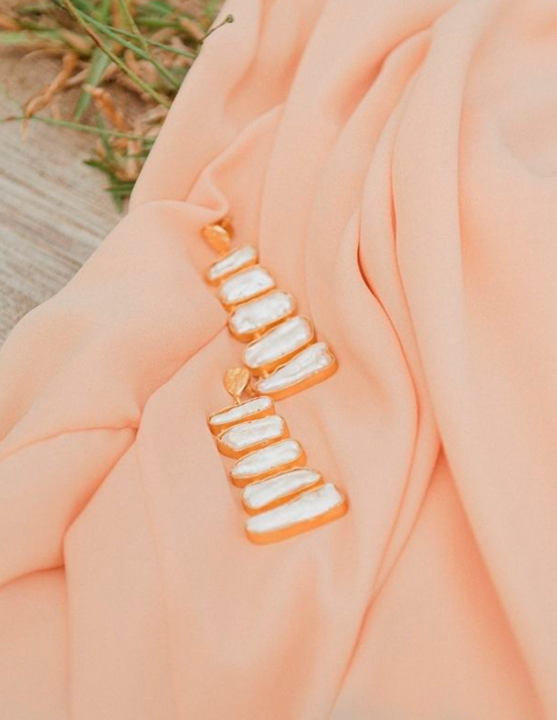 - Material: Gold plated brass with pearls.