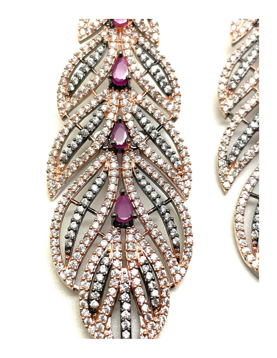 Handmade, these earrings are surprisingly light. They are a unique and extraordinary piece. The zircons and crystals make this piece cast a beautiful, natural light on your face.