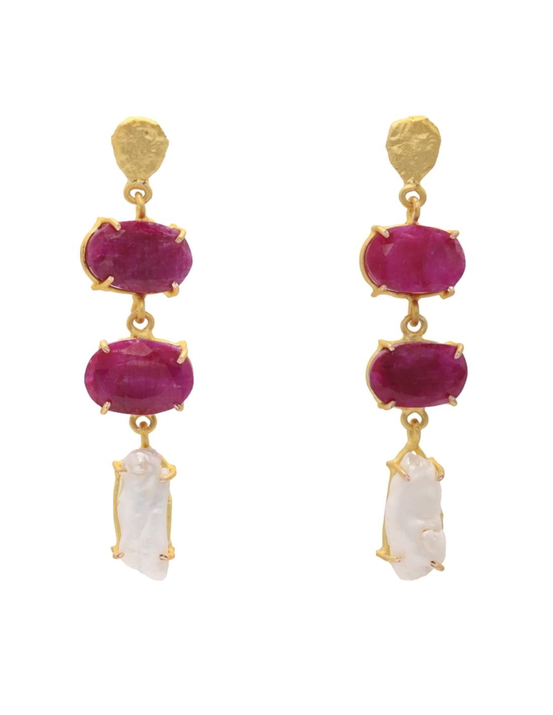 Beautiful long earrings with natural ruby and white stones for guests. This ideal accessory is made of brass structure with gold plated and composed of two irregular ruby stones and ends with another more elongated stone in white.