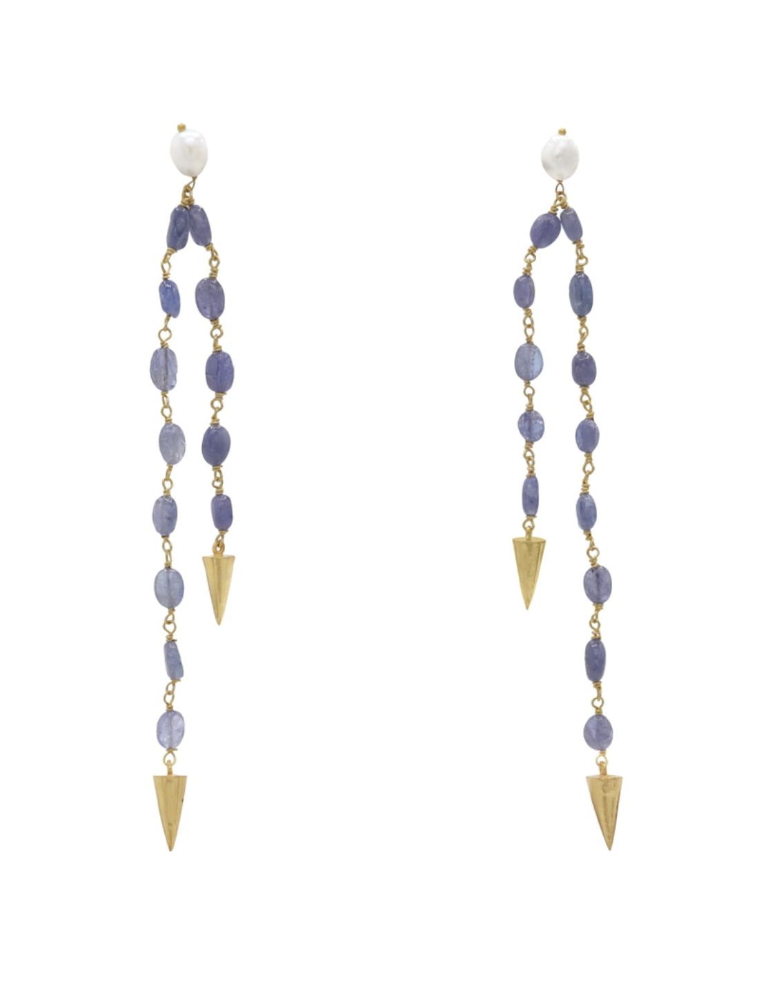 These guest earrings are handcrafted in gold-plated brass and have a design of two lines of stones that end in a golden cone each. Its pelvetia type stones are inspired by a type of arda algae of the Fucales order.