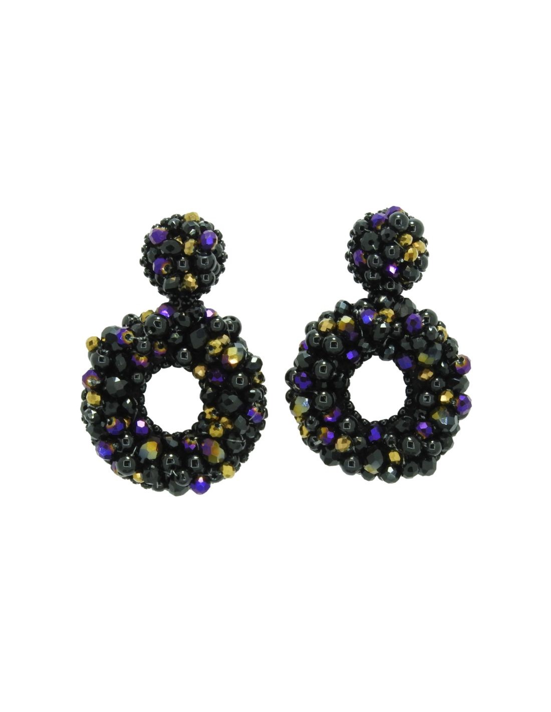 These party earrings for events are handmade with crystals and beads sewn one by one in a circular shape, in brown and dark multicolour. They incorporate pin and stopper in nickel-free steel that allow you to wear them with health and safety.