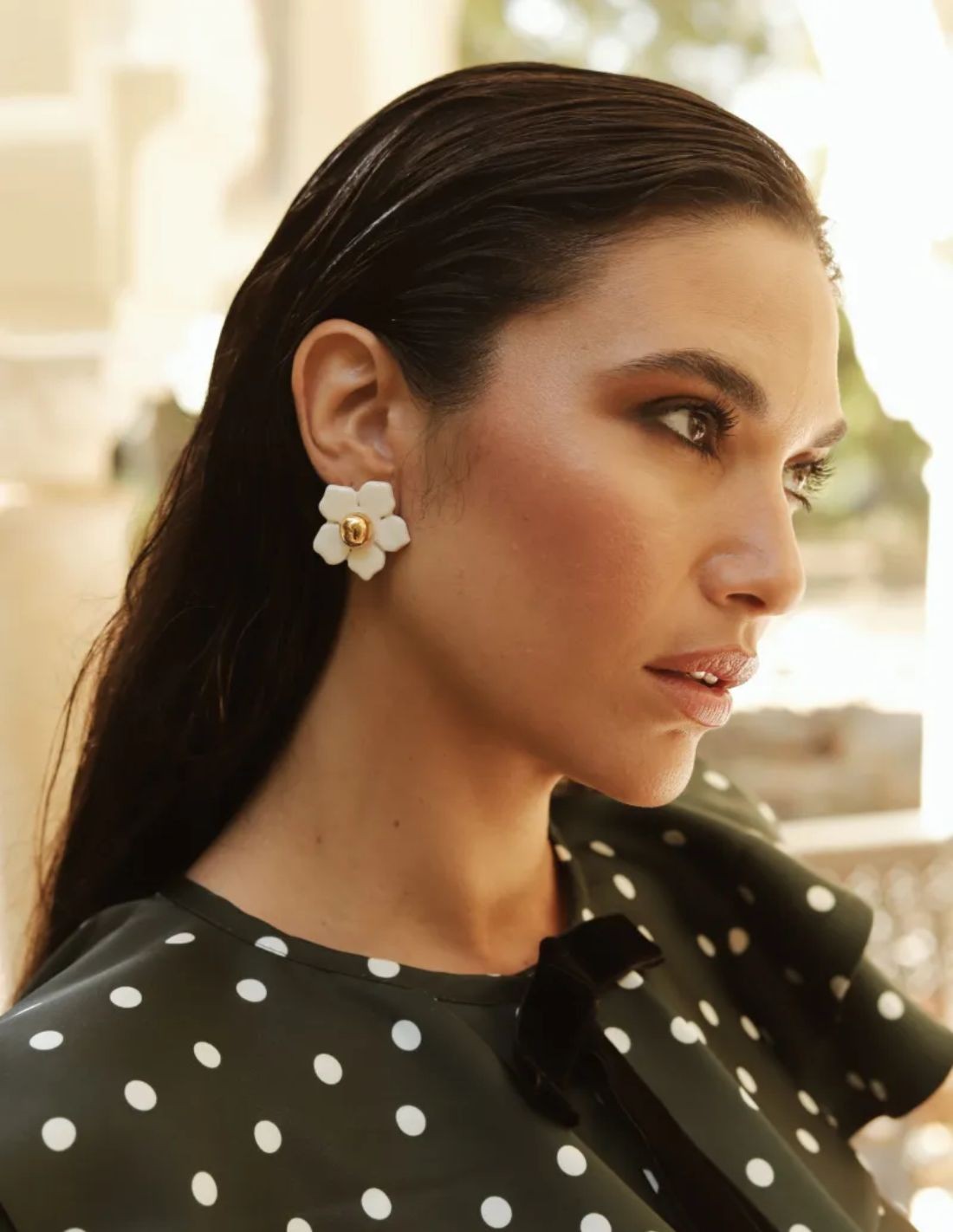 These earrings for guests are handcrafted in the shape of an enameled ceramic flower decorated with 24k gold luster. A versatile accessory to wear in special events such as weddings, baptisms, communions and graduations.