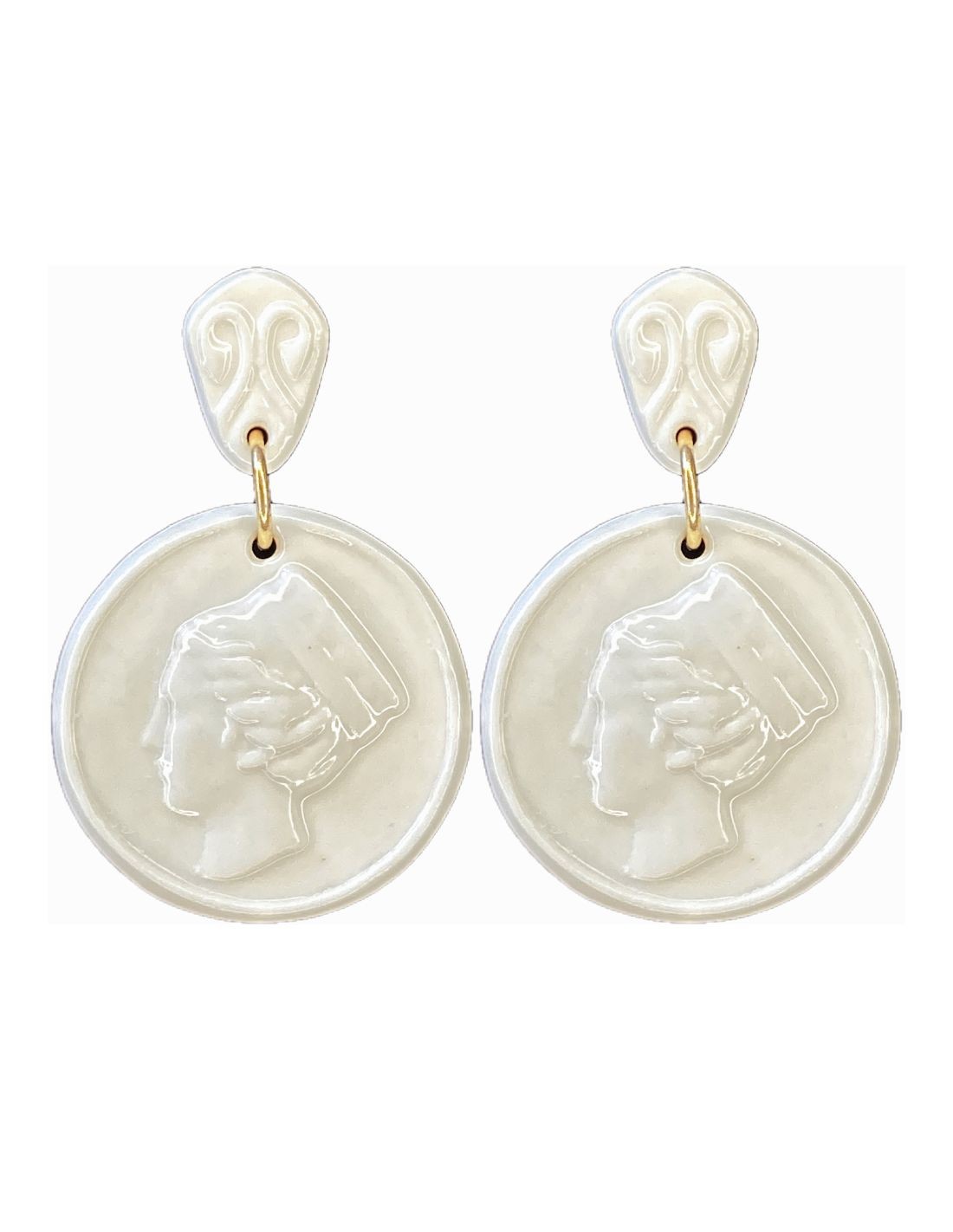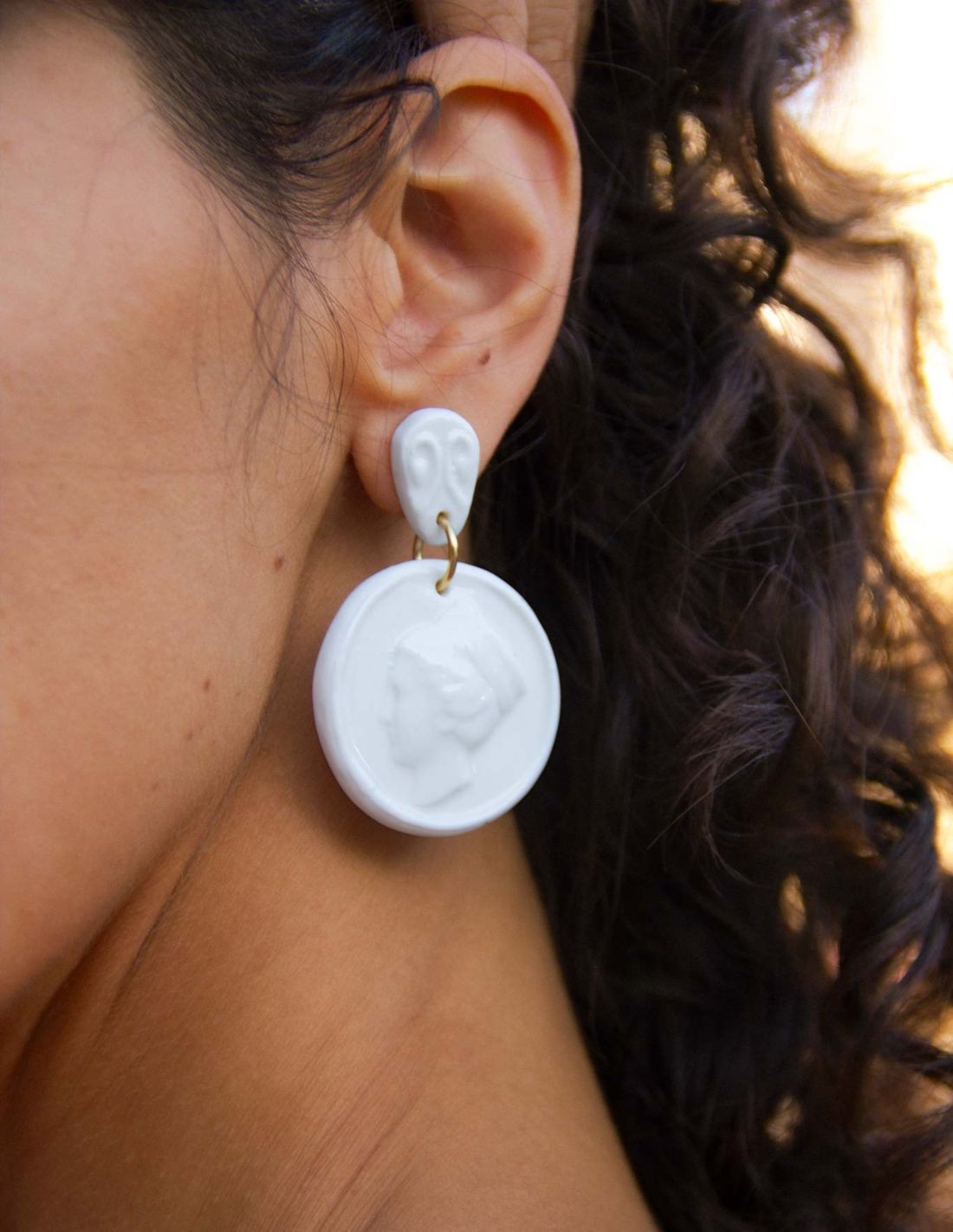 Long white ceramic Cibeles medal earrings for guests, brides, bridesmaids and special events.