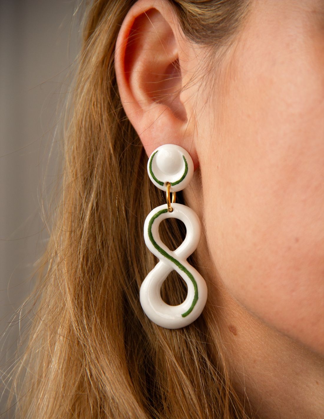 These earrings are handmade by the best artisans, using pure ceramic porcelain and highly hypoallergenic gold plated fittings. Inspired by the infinity symbol and hand painted with green enamel totally non-toxic.