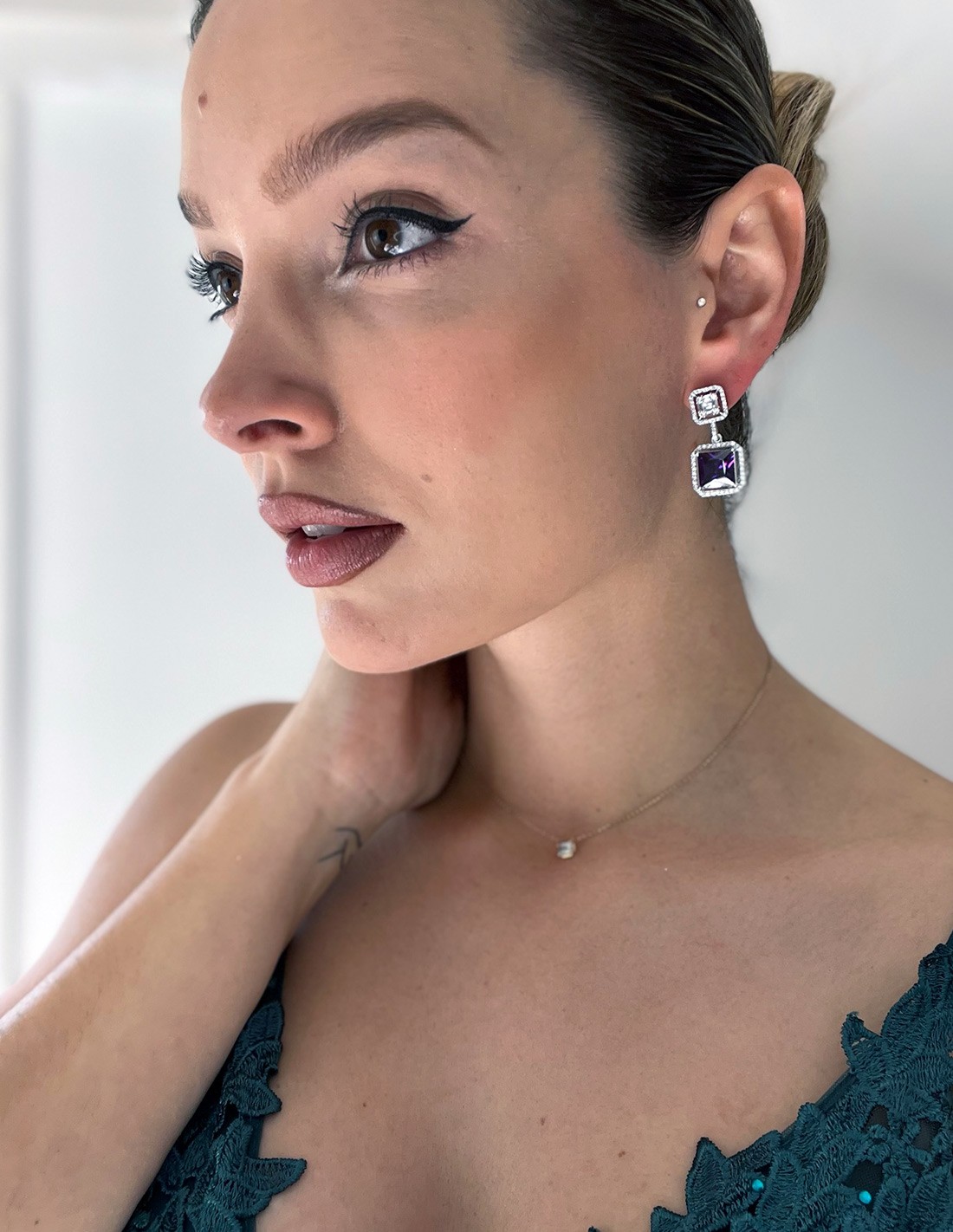 An ideal accessory to give that touch of light to your whole outfit. A party earring with a medium length, made with zircons and precious stones. In this case, you can choose between lilac, red or pink.