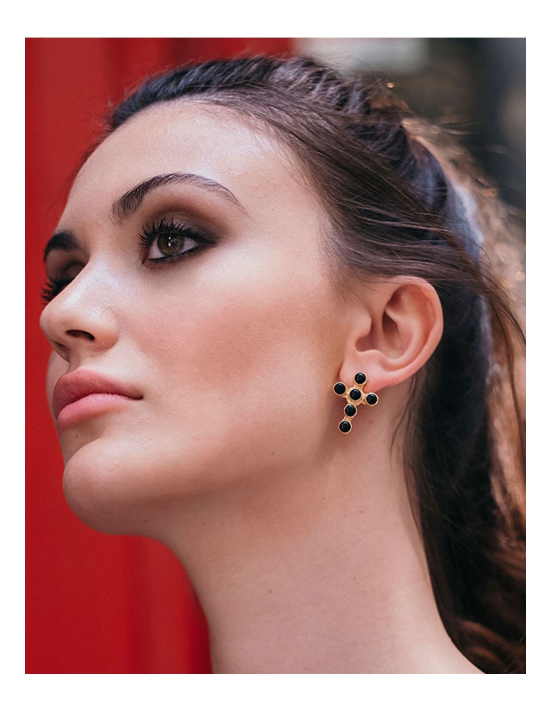 Golden crossearrings with black stones for guest. These beautiful black and gold cross earrings are a perfect gift and a perfect complement for guest events. Its small size is perfect to add a different touch but without determining your style.