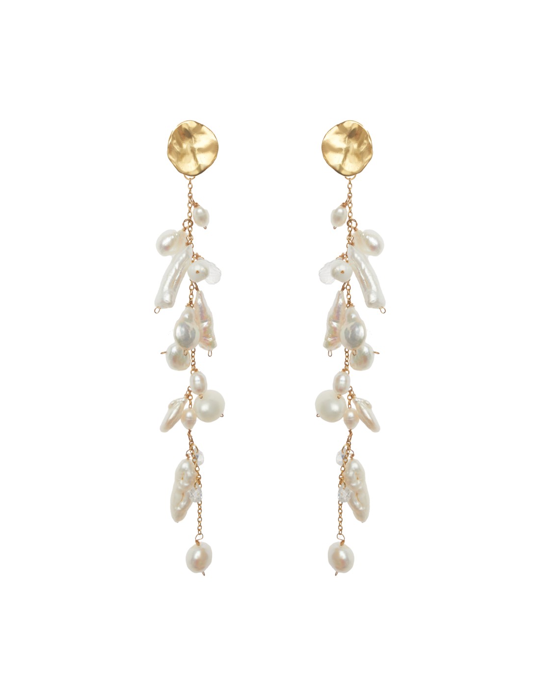 If you are one of those who bet on an elegant accessory that stands out, these extra-long earrings will be your greatest ally. These earrings have a long golden design with a 22k gold plated finish, with pearl pendants that fall smoothly. An ideal accessory for those looking to stand out at their next event, or even for brides looking for an original accessory to complete their look.