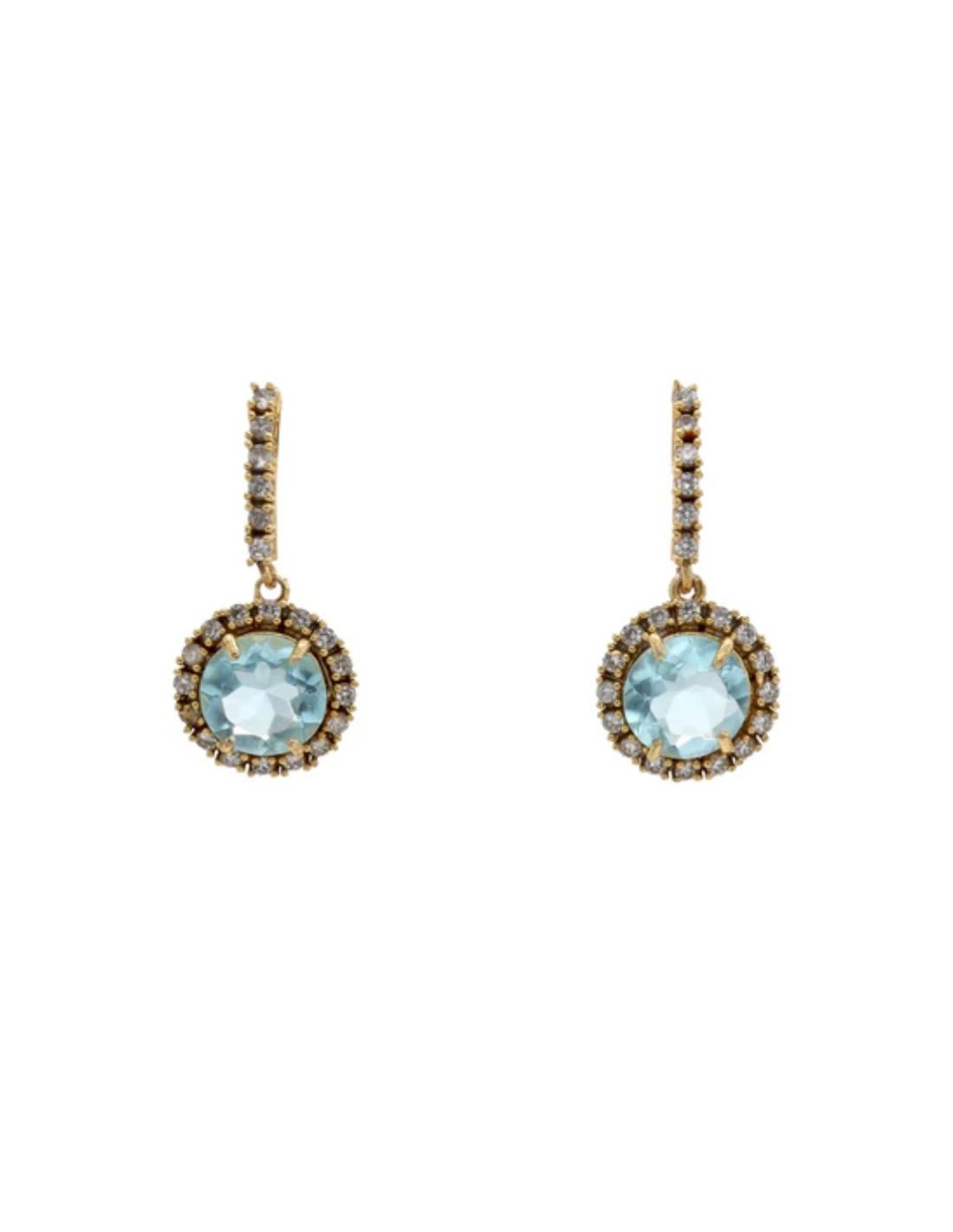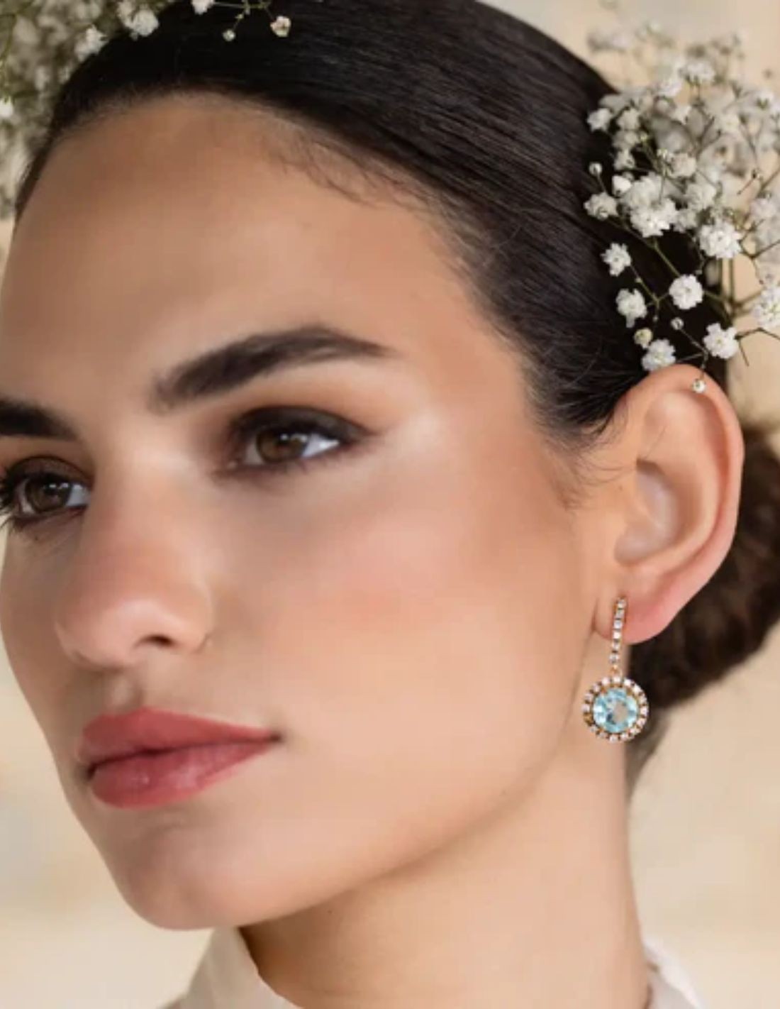 If you are one of those guests who like to wear subtle and elegant guest accessories or if you are a bride and you are looking for earrings to shine for sure, these will be a hit. Small size earrings made of gold plated brass with zirconia, with a central aquamarine stone surrounded by small zirconia stones, and with nut closure. Ideal to combine with your guest look or with your wedding dress.
