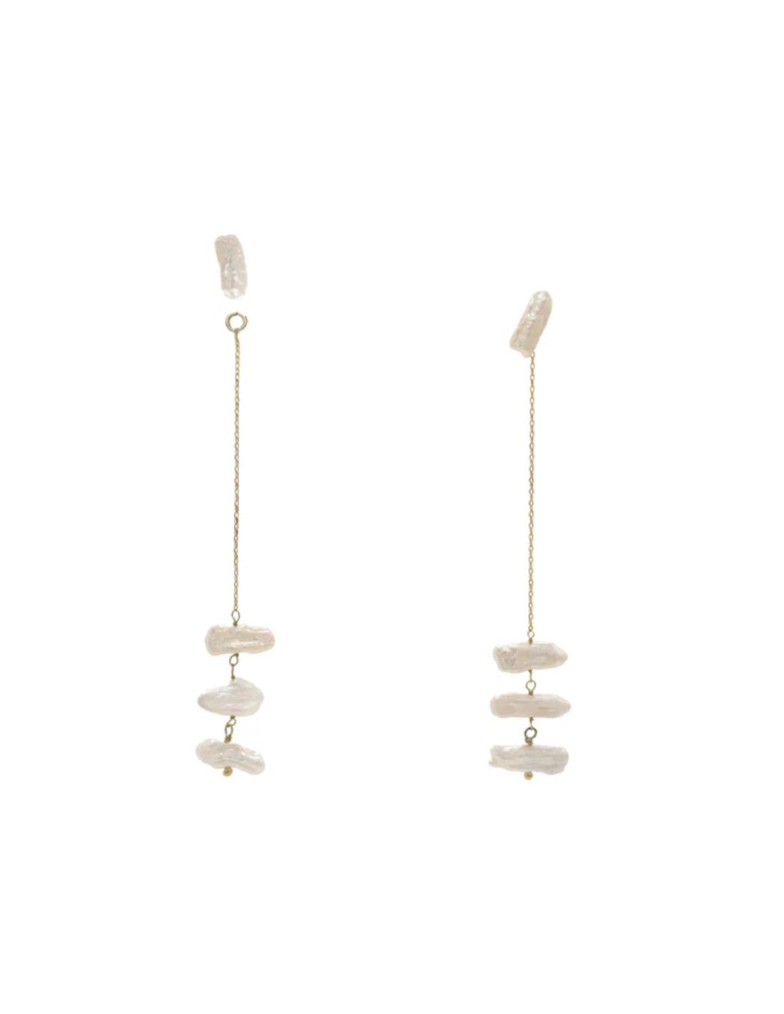 Earrings designed for those guests or brides looking to complete their look in an elegant and delicate way. Earrings with a long design composed of long golden chains accompanied by irregular pearls suspended horizontally. A detachable design that you can wear with or without the lower pendant, as desired. Ideal for special events such as a wedding.