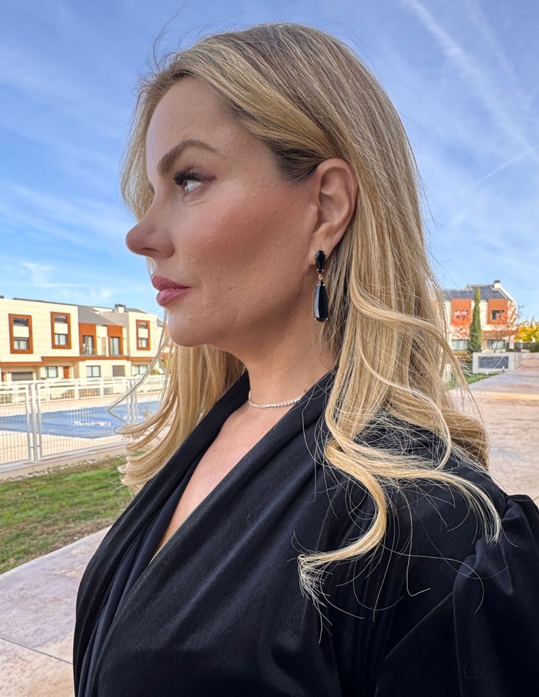 These elegant black earrings stand out for their timeless design, with a small black stone at the top, from which delicately hangs a black teardrop that adds a touch of sophistication. Their dark, shiny finish makes them the perfect accessory to elevate any look, whether as a guest or for a special occasion.
