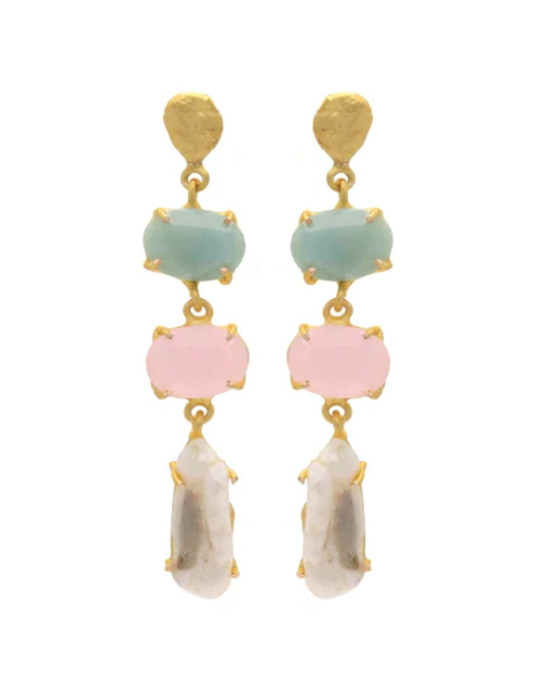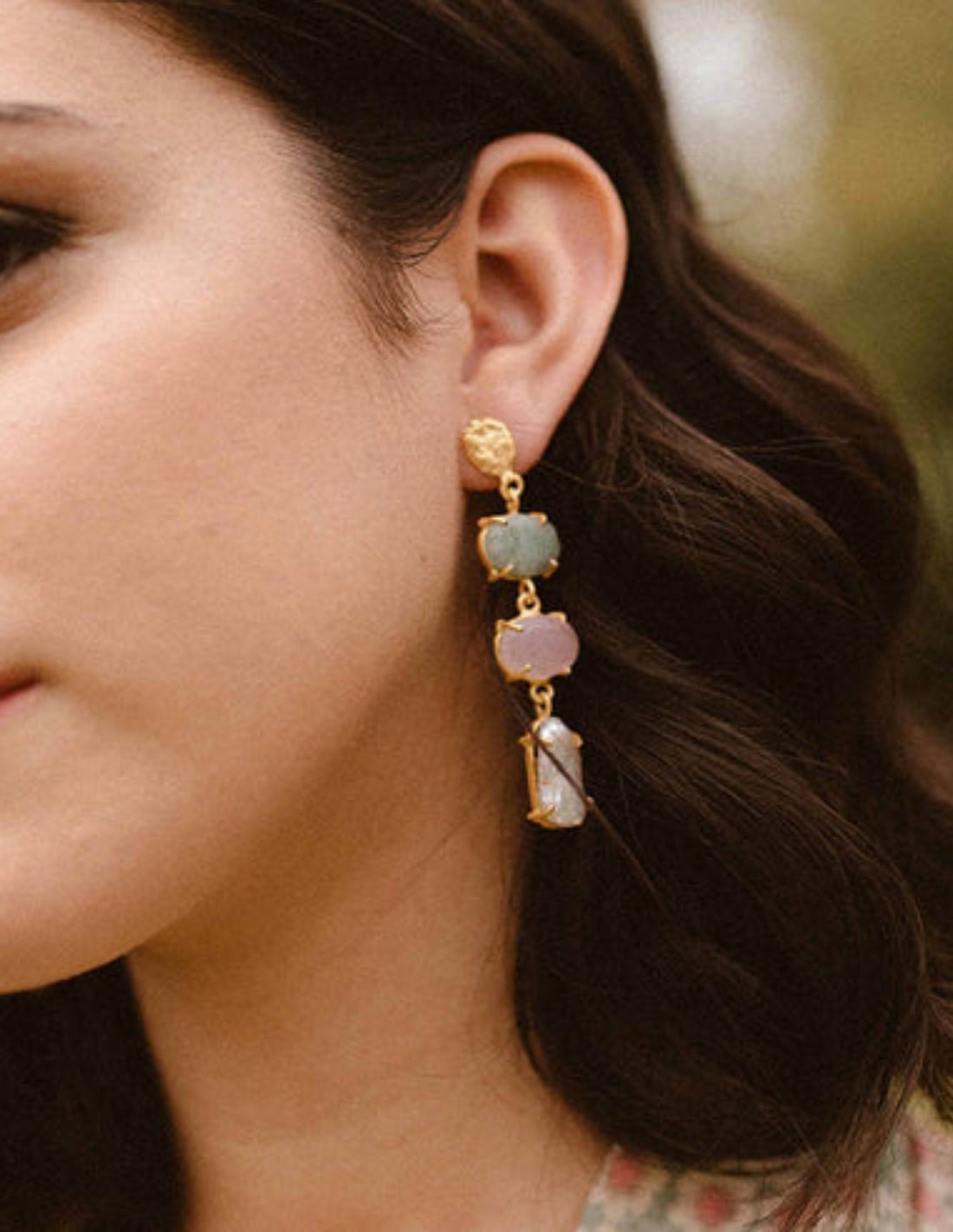 These earrings stand out for their delicate and original design, formed by three stones that add a charming and distinctive touch to any style. Their balanced composition combines elegance and personality, making them a perfect accessory to complement both formal and casual looks.