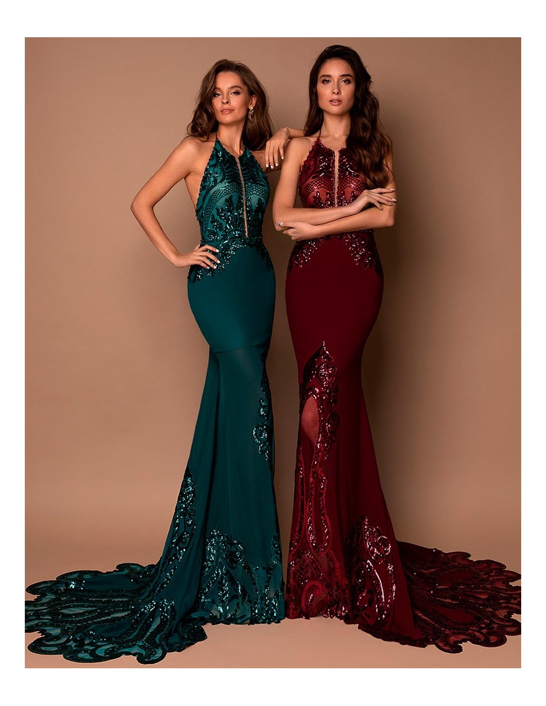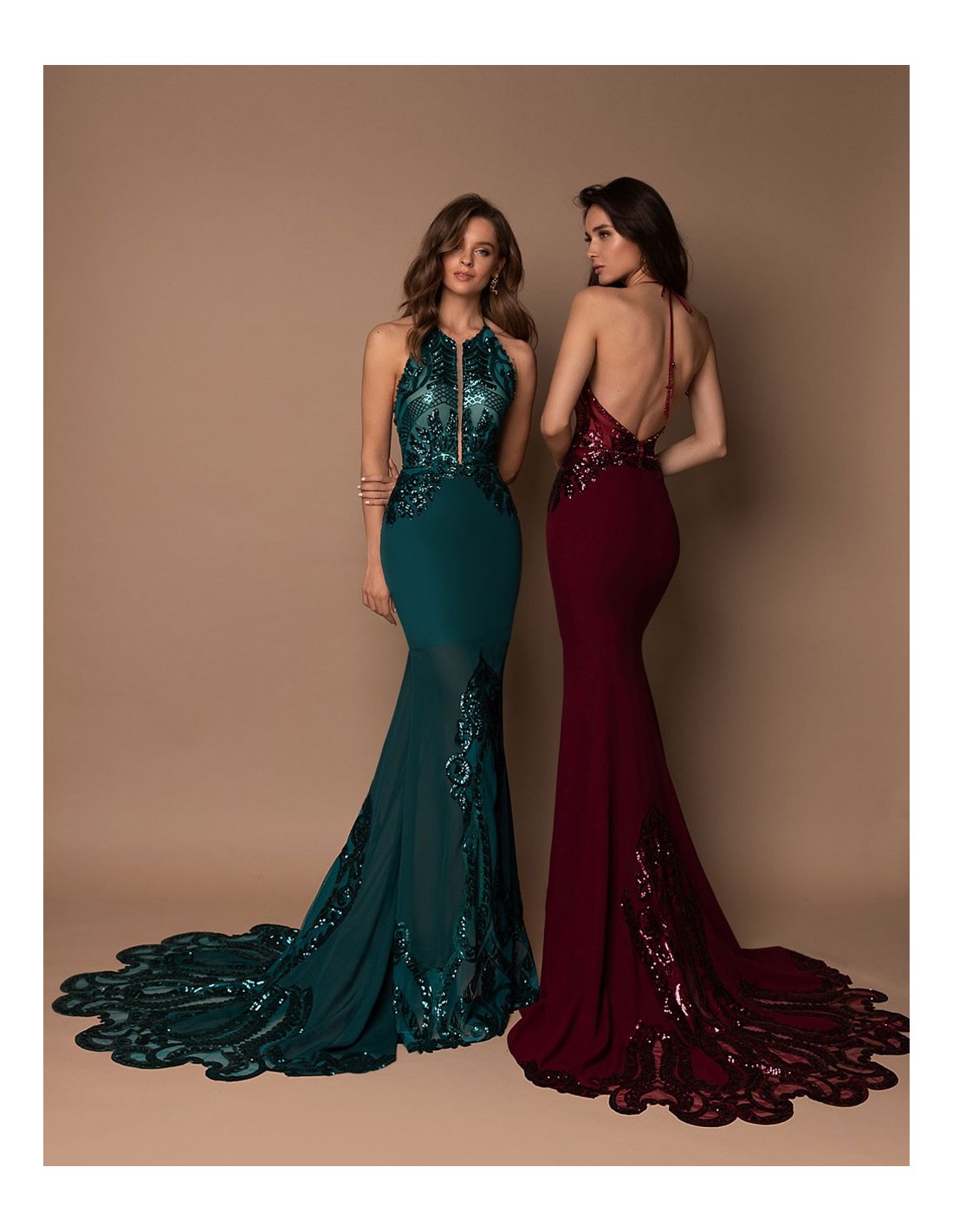 Very elegant long gown in godet silhouette with a beautiful train decorated with sequins and crystals.