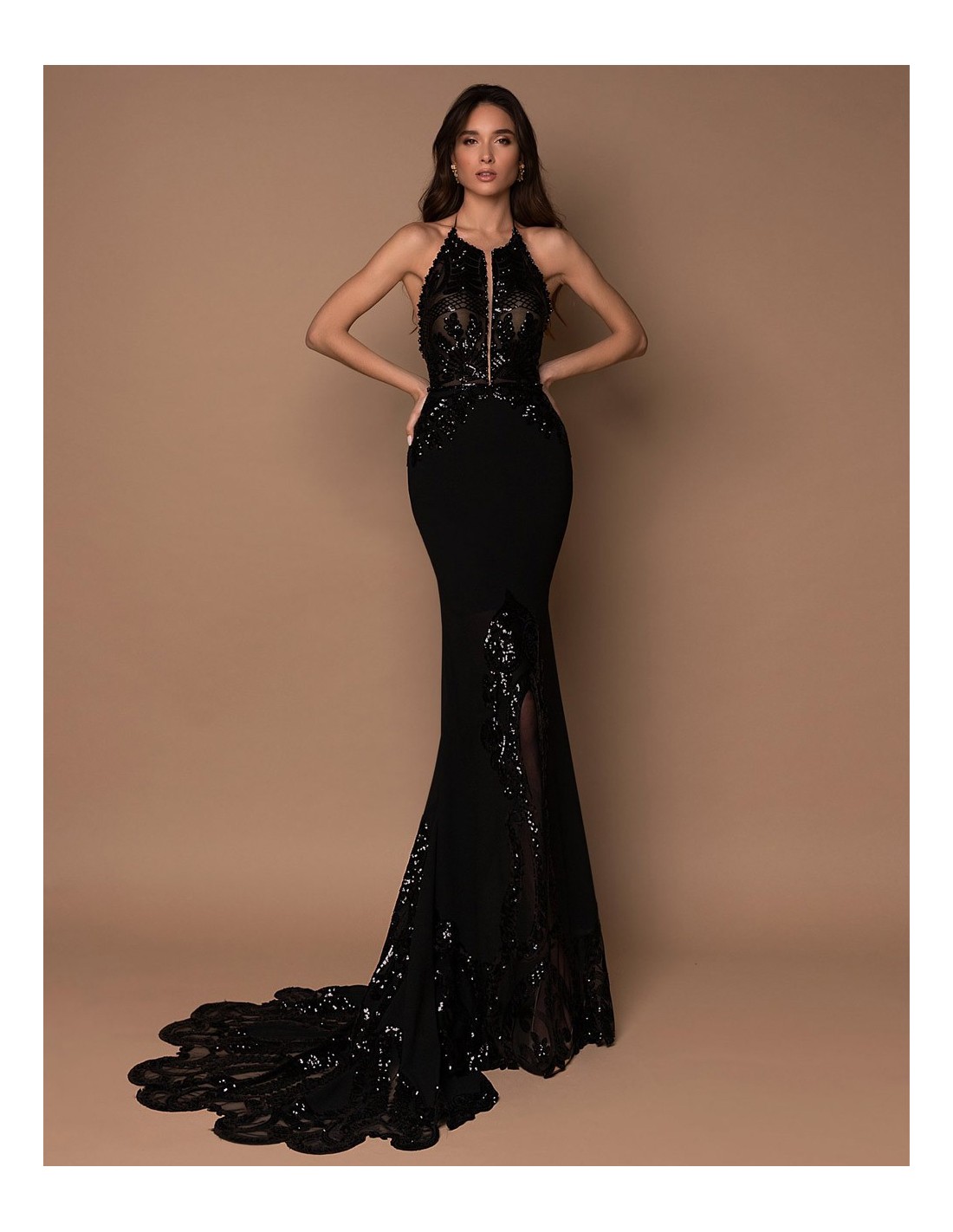 This evening dress is decorated with sequined guipure elements and embroidered with crystals of different sizes. Handcrafted with the best qualities.